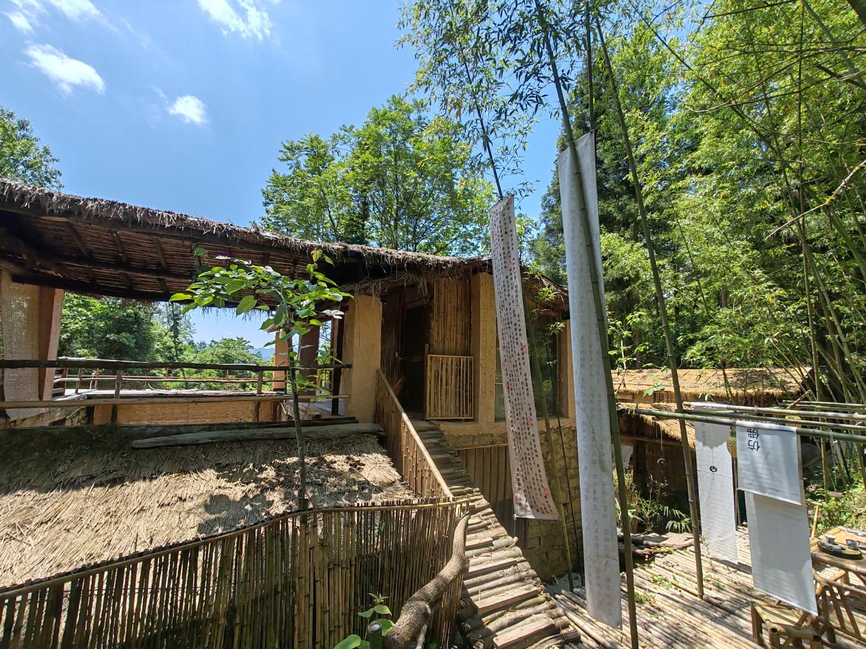 初见白马草堂时,是一个微雨的傍晚。车子沿着蜿蜒山路爬升,眼前的景象逐渐从钢筋水泥变成层叠绿意。转过一道弯,竹篱笆围成的小院忽然映入眼帘:茅草屋顶泛着湿润的光泽,竹木墙壁与周围的树林融为一体,暖黄的灯光从窗缝里透出来,像山林睁开了温柔的眼。
