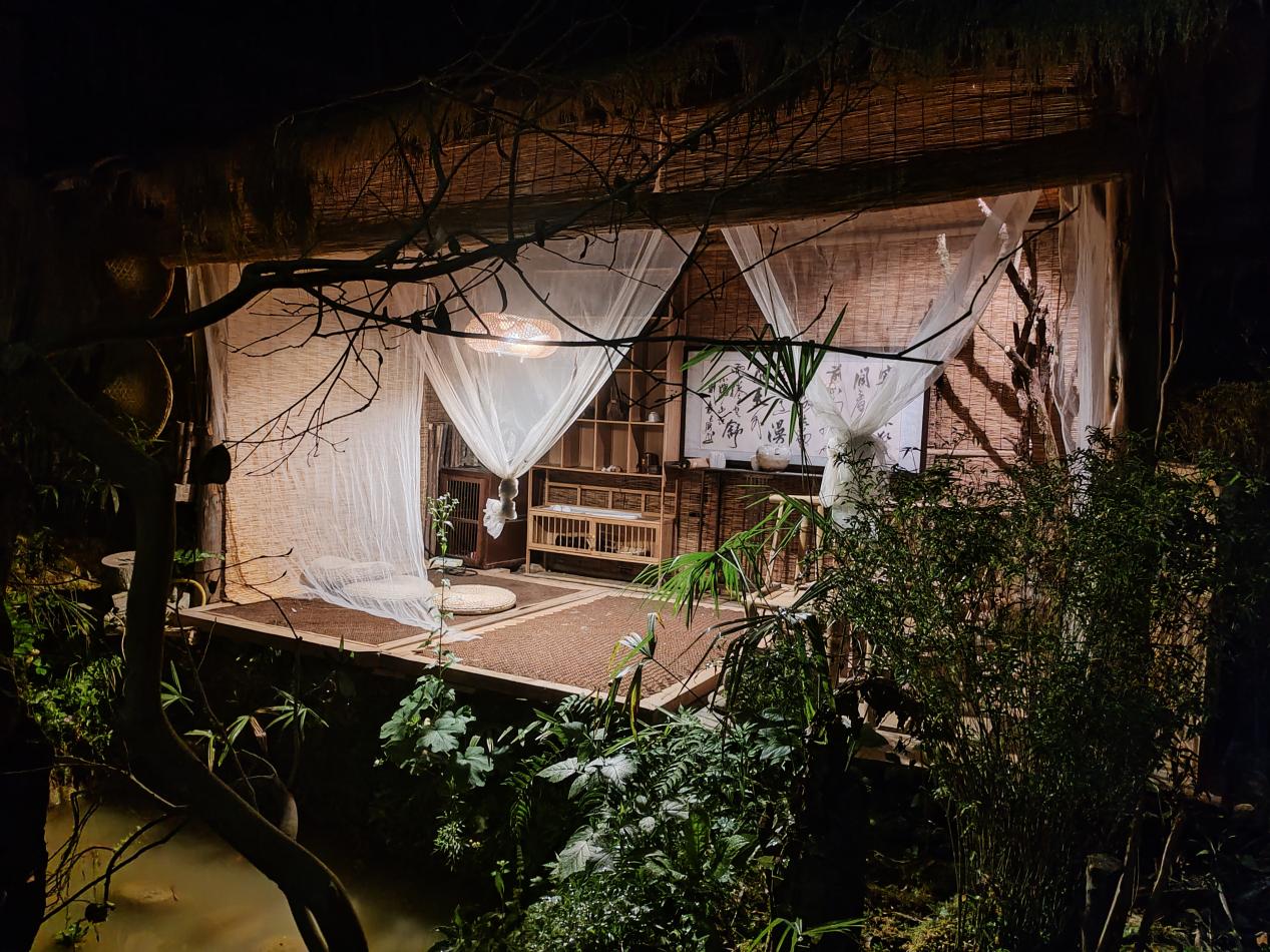 夜幕降临,草堂成了另一个世界。茅草屋顶垂下半透明白纱,灯光从里往外漫,把竹榻、矮桌笼在暖黄朦胧里。我和朋友披着同一条毯子,坐在纱帘后看树影摇晃,像场无声的皮影戏。