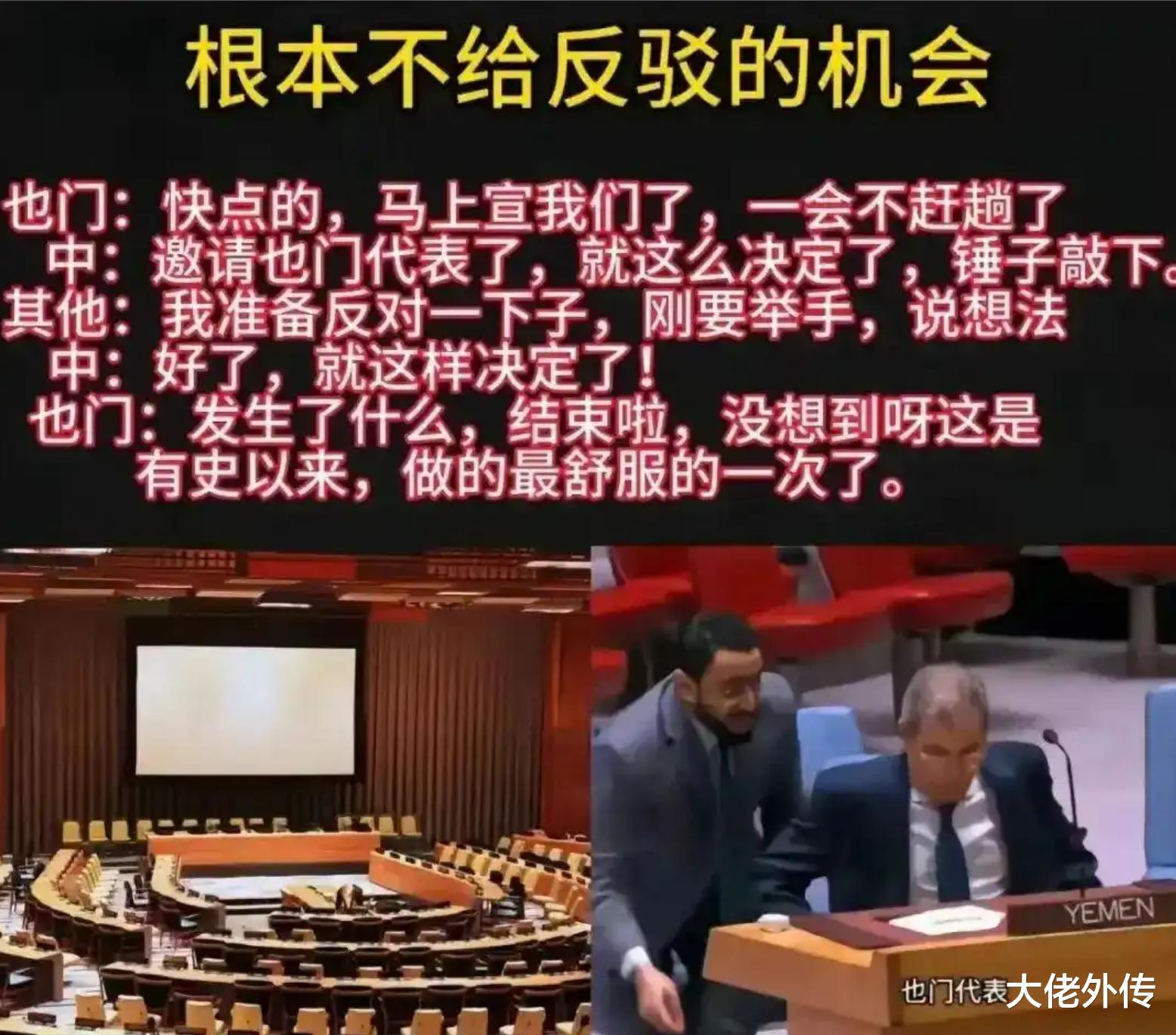 耿爽的这句话让人们备受鼓舞,在人们看来这5个字的含金量和攻击力特别高,随后也门大使坐到会议席位的时候,特别激动,有网友表示,也门大使激动的连凳子都不会坐了,有网友甚至调侃道:“原来列强就是我自己。”