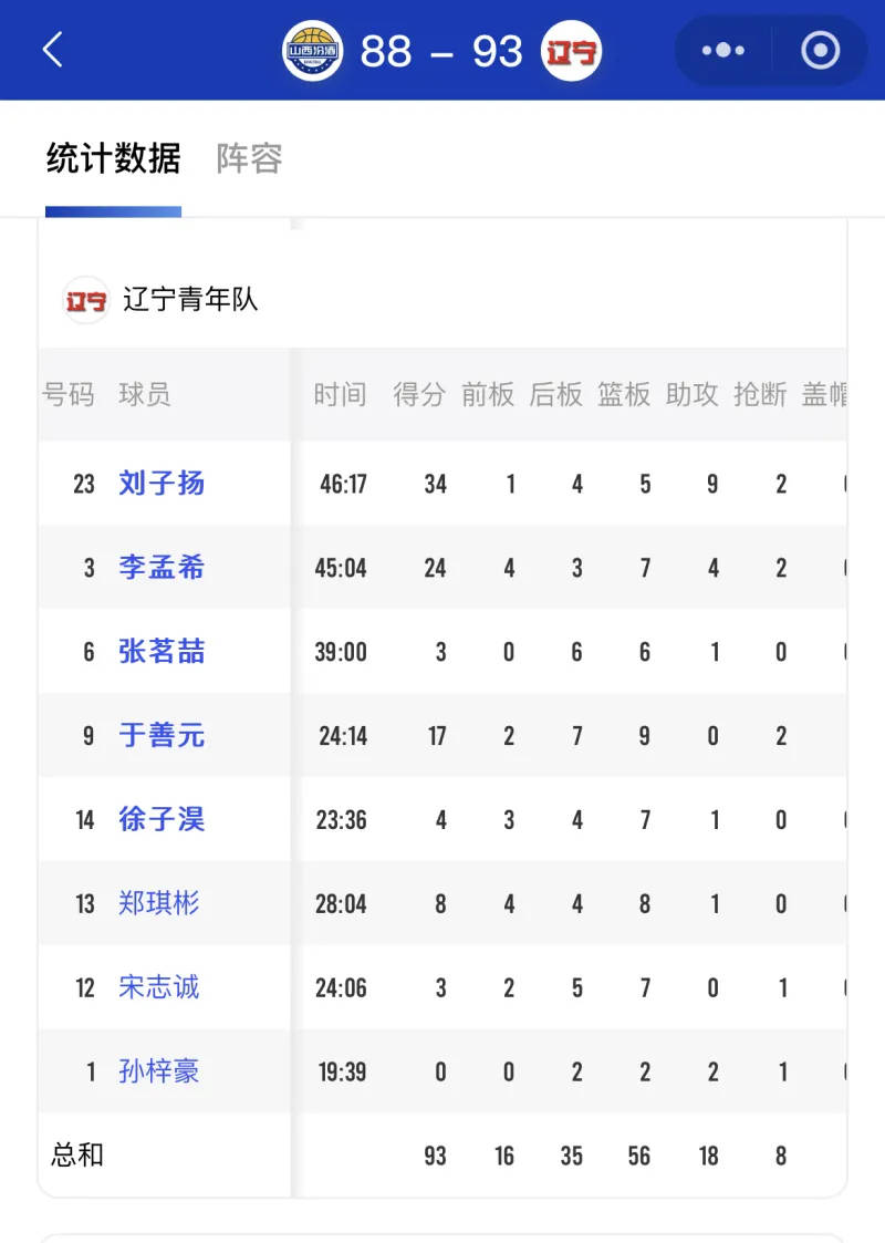 看一下球员数据,刘子扬34分5篮板9助攻,李孟希24分7篮板4助攻,于善元17分9篮板。