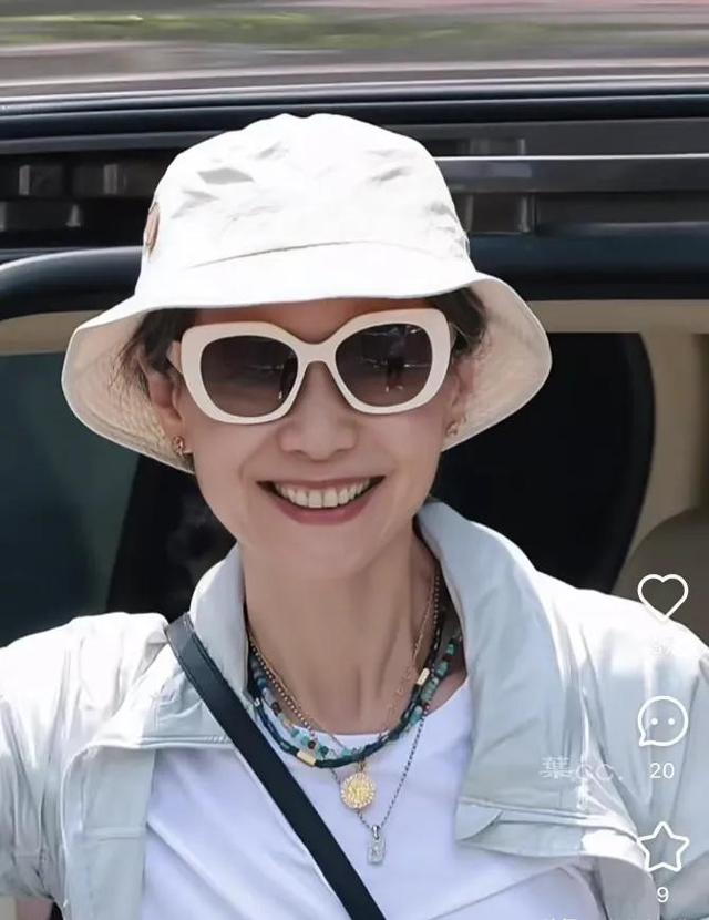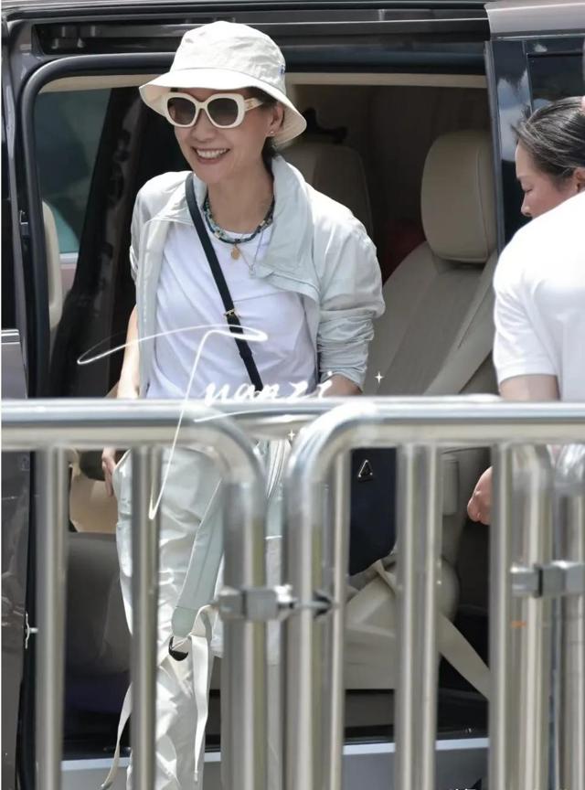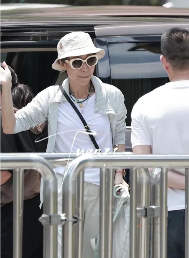 叶童穿着白色短袖外边还有防晒服,因为天气实在太热了,她戴了一顶帽子,还带上了墨镜,看起来很年轻。
