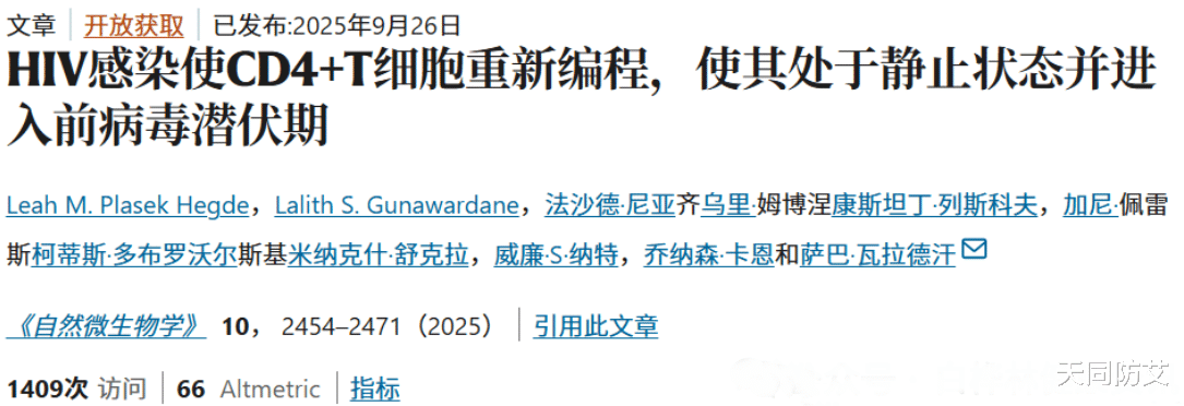 近日,美国凯斯西储大学研究团队在《Nature Microbiology》杂志上发布了一篇名为《HIV感染使CD4+T细胞重新编程,使其处于静止状态并进入前病毒潜伏期》的文章。