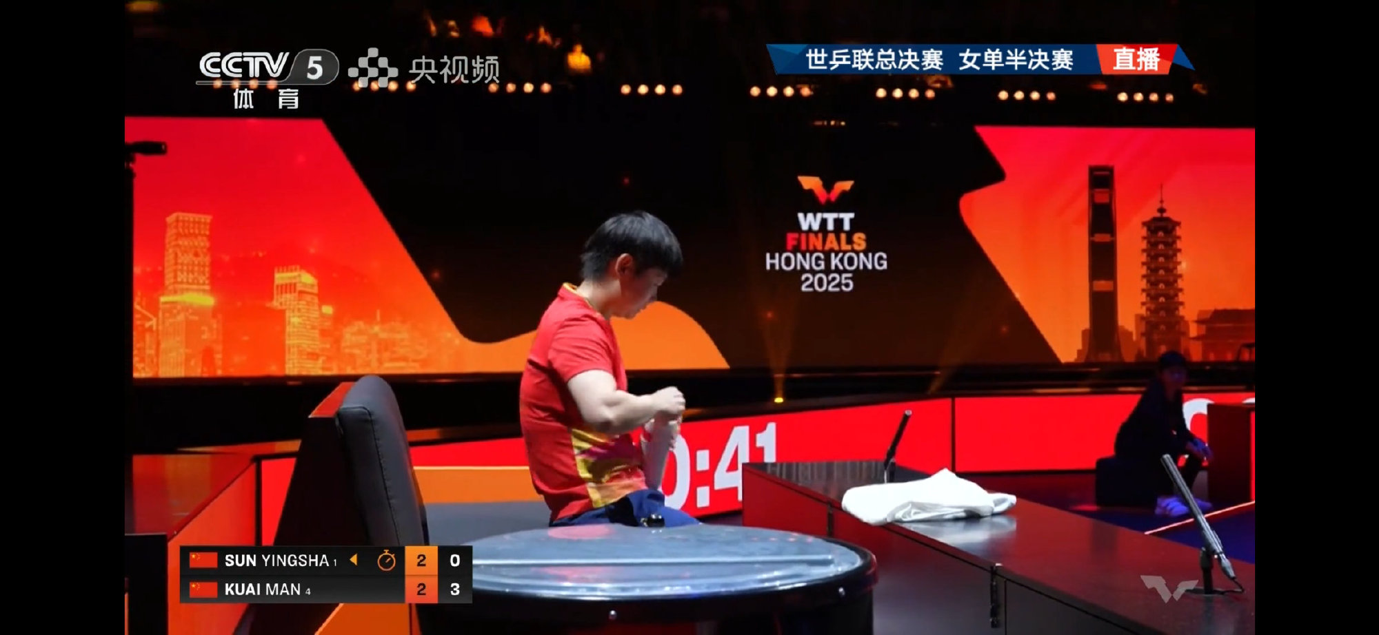 12月13号晚上,WTT年终总决赛在香港打女单半决赛,世界第一孙颖莎碰上队里的小师妹蒯曼。俩人前四局打成2比2,场面挺胶着。第四局刚开始,孙颖莎突然感觉左脚脚踝不对劲,马上举手叫了个医疗暂停,队医冲进场,给她脚腕缠上厚厚的肌贴和绷带,看着就疼。她咬牙回到球台,硬把第四局拿下来,比分追平。可第五局脚一蹬地就钻心疼,移动明显慢半拍,只拿了3分就丢了这局。第六局开始前,她试着跳了两下,脸皱成一团,跟裁判摆摆手,宣布退赛,蒯曼直接晋级决赛。