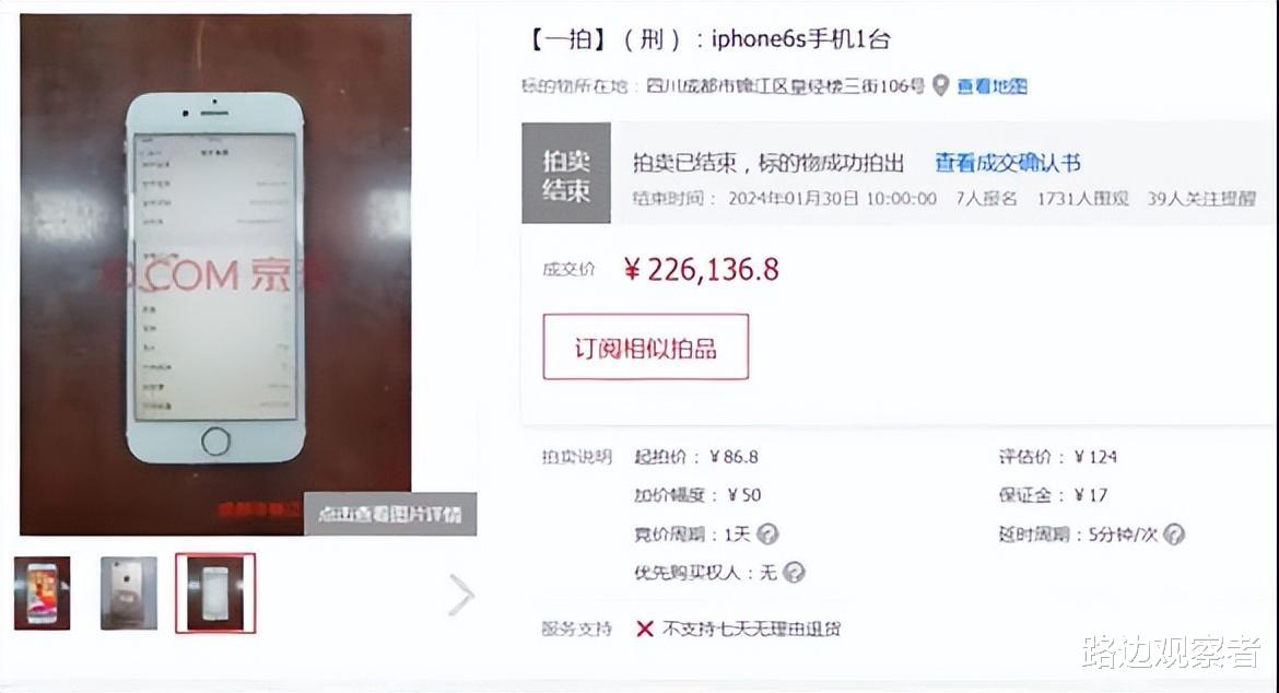 故事的主角是一台旧的iPhone6s,它平凡无奇,甚至有点过时。但就在1月29日,这台看似普通的手机上架京东司法拍卖平台,起拍价仅为86.8元,评估价也不过124元。然而,谁也没想到,这场拍卖会变成了一场价格疯狂飙升的狂欢。