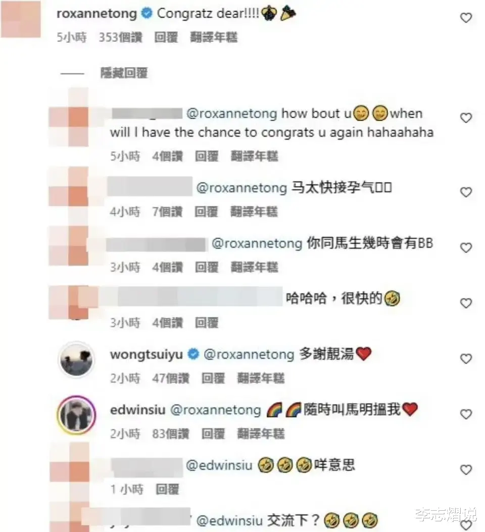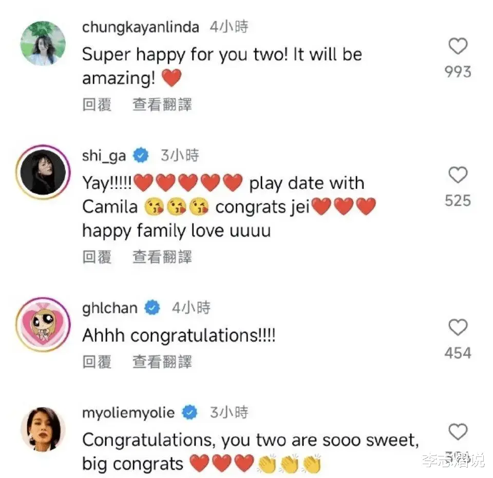 消息传出后,不少圈中好友都纷纷送上自己的祝福,其中包括连诗雅、杨茜尧、胡杏儿、胡定欣、马国明夫妇、李施嬅以及钟嘉欣等人,看得出黄翠如的人缘很好,加上其另一半也是圈中人,自然有很多艺人好友。
