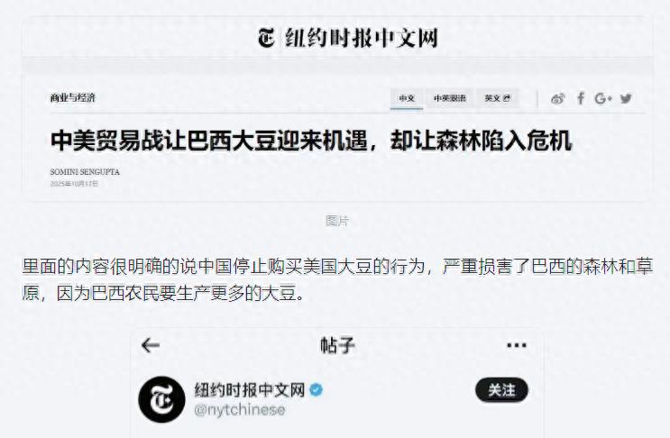 最近《纽约时报》的一则报道真是把人看懵了!这篇据称由某大学教授执笔的文章,居然堂而皇之地指责中国购买巴西大豆的行为"严重破坏巴西森林"。这逻辑简直离谱到刷新认知,合着中国花钱买东西还得背黑锅?怕是巴西人听了都得翻个白眼:我们的大豆卖给谁,怎么卖,关美国什么事?
