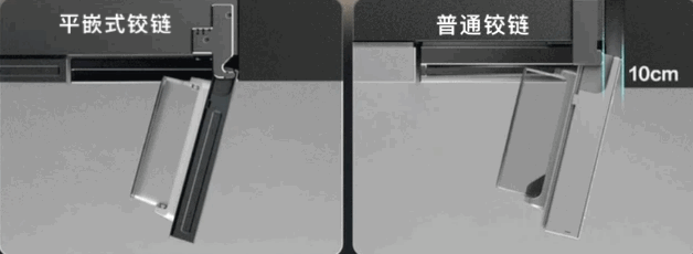 传统嵌入式冰箱在嵌入柜体时,左右两侧一般需要各预留10cm大缝隙才能保障冰箱的侧面散热与冰箱门的正常开启。TCL T9 Pro超薄平嵌冰箱采用了平稳嵌入式铰链,甚至可以贴墙90°直角开门,这台冰箱的散热设置到了冰箱底部,平嵌无缝安装也不影响冰箱正常散热。