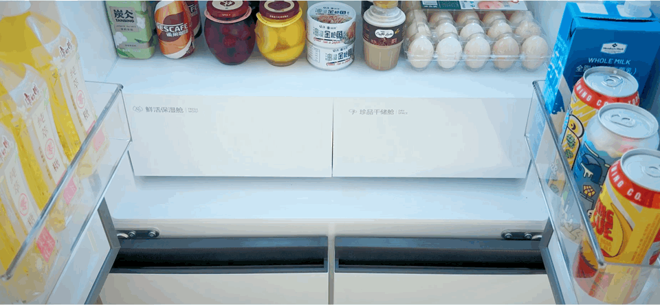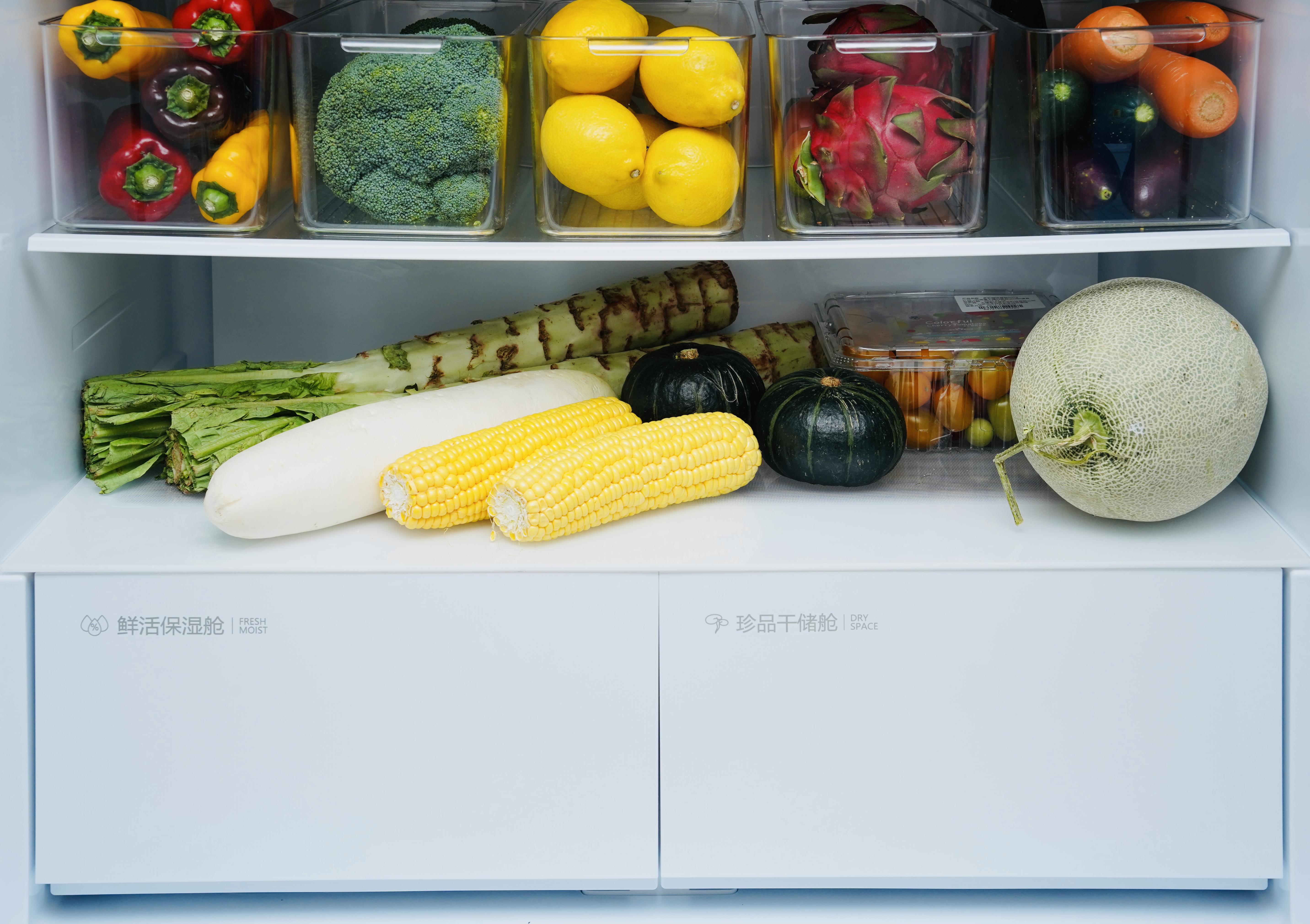 在冷藏区中的下方还设置了两个干湿分储抽屉,鲜活保湿舱用于长时间存放精品果蔬,珍品干储舱用于存放干果食材再好不过。