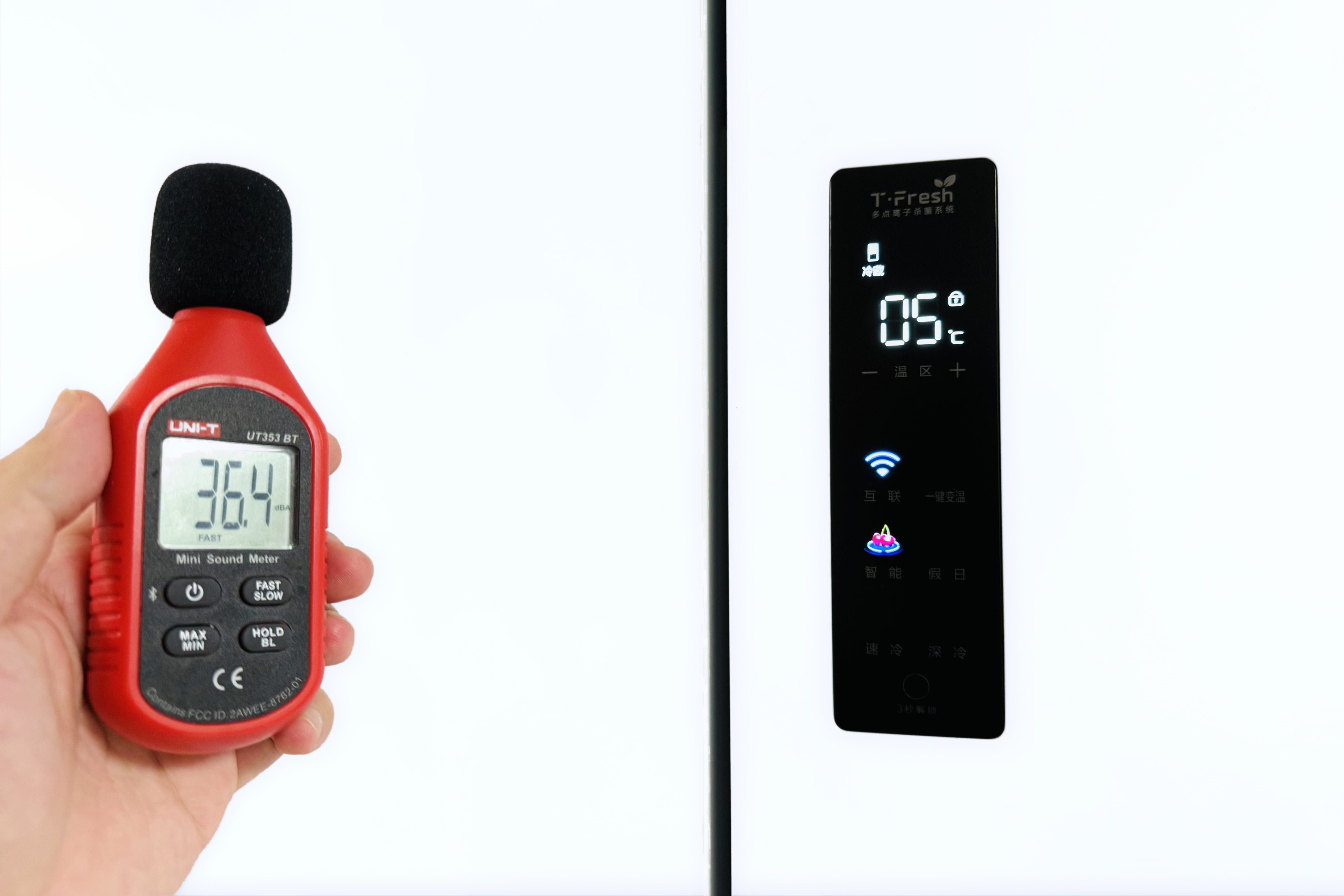 双变频除了更加节能,在双系统两套蒸发器的配置下,家里的噪音测了一下差不多是36-37dB,贴近冰箱近距离测得噪声也仅有36.4dB,没有超过环境噪音,还是挺安静的。这台超薄平嵌冰箱无论在厨房还是客厅,运行时都是可以忽略不计的静音状态。