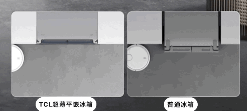普通冰箱往往较厚,放入柜子中难免会突出一块,不仅影响美观,还会影响日常地面清洁。TCL T9 Pro超薄平嵌冰箱在60cm深的标准橱柜柜体轻松实现无缝式嵌入,前后不突出,视觉效果更好,同时利于家里扫地机器人工作更为有利,清扫起来更不担心留死角。
