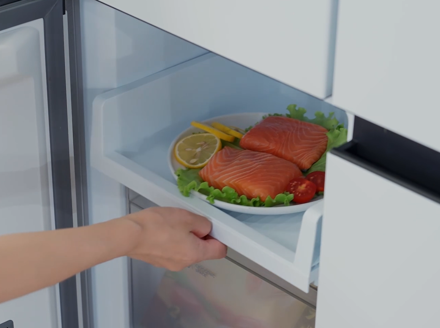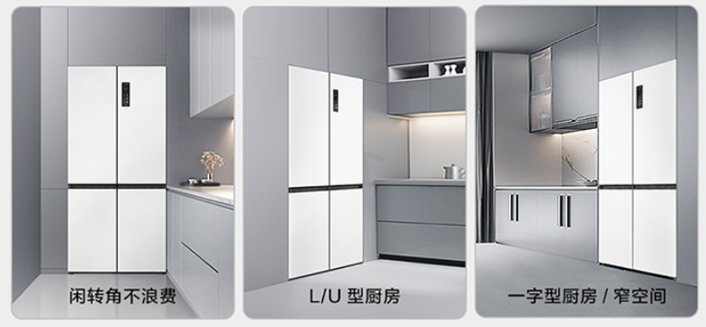 在冰箱门90°开启的状态下,冷藏、冷冻抽屉也可以丝滑拉出取物,对于一字型厨房、转角型厨房也可以安心嵌入安装这台冰箱。