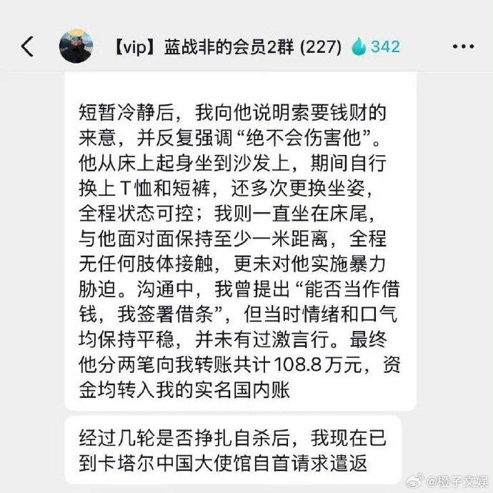2025年12月11日,疑似绑架蓝战非的那个人突然在粉丝群内发布千字自首声明,却因关键细节与受害者陈述、使馆官方回应存在根本矛盾,引发全网对真相的激烈争议。