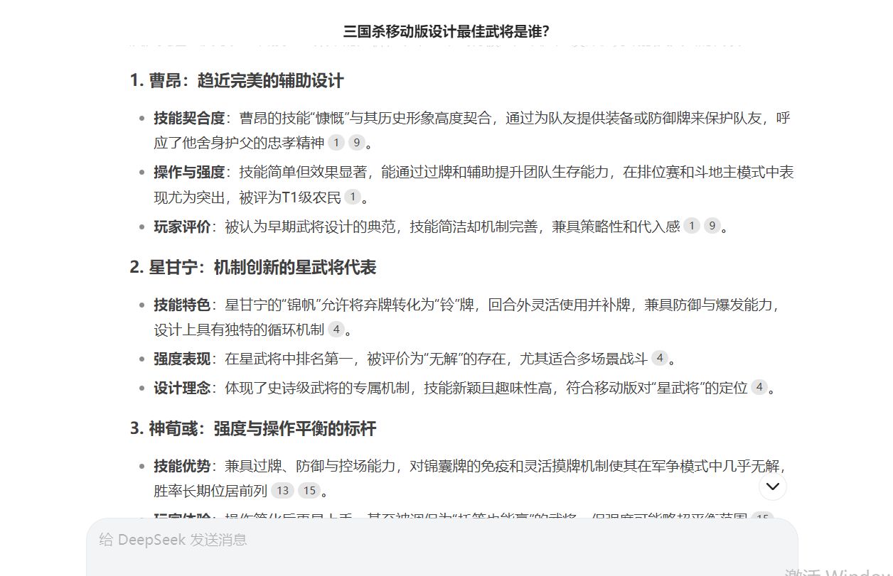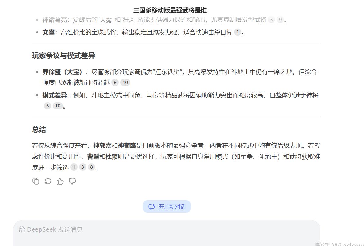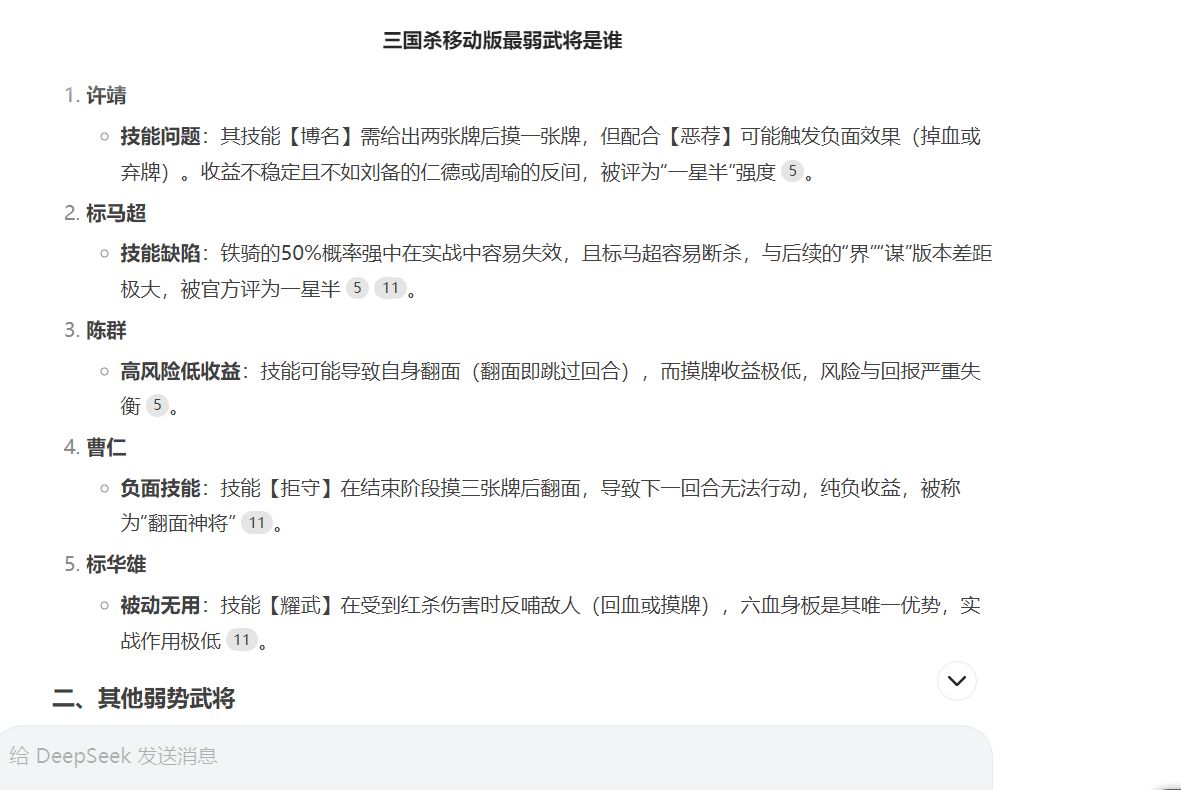 大家好,我是戎马定半生。最近国产ai火了,号称超越美国ai,能够解答一切问题,并且逻辑、结果都很合理。今天就用用最火的deepseek软件回答三国杀问题会如何,谁最强?谁最弱?
