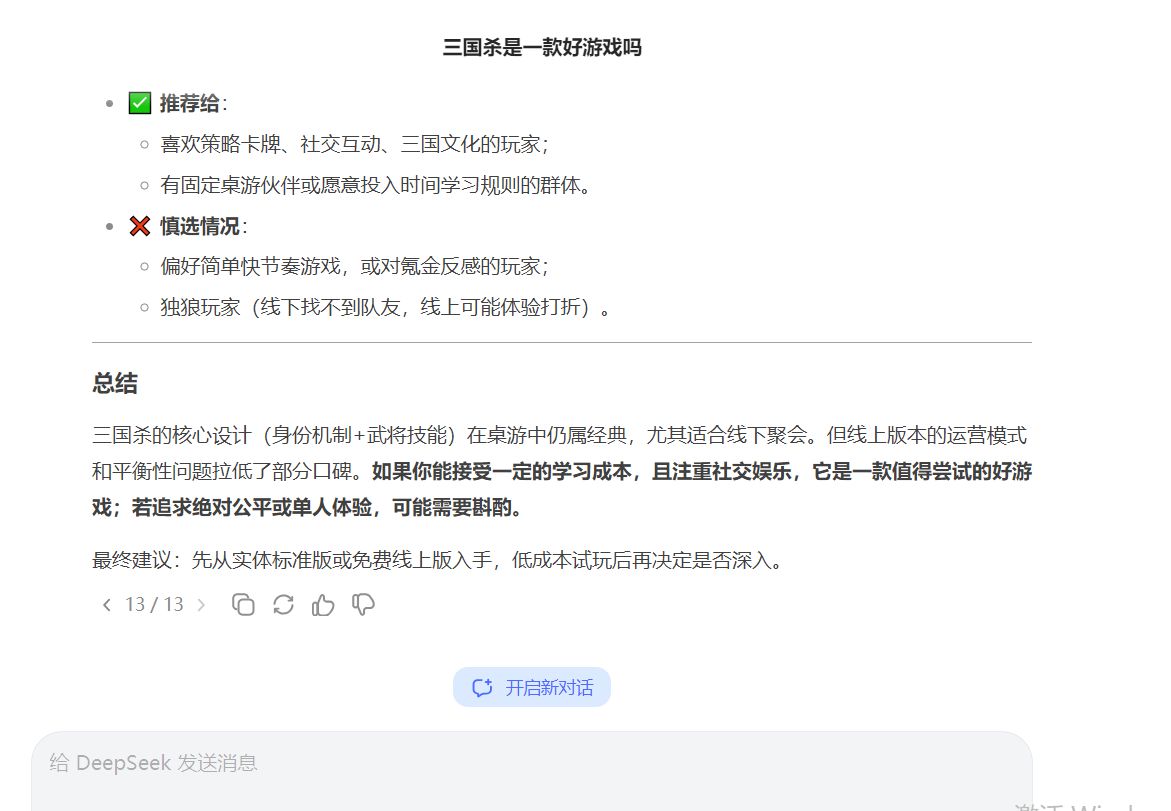 简而言之就是,游戏设计经典,但是线上版是氪金巨兽,线下版低成本,但缺志同道合的朋友。以上就是deepseek对三国杀问题的答案,你觉得如何?更多三国杀资讯,就在戎马定半生!