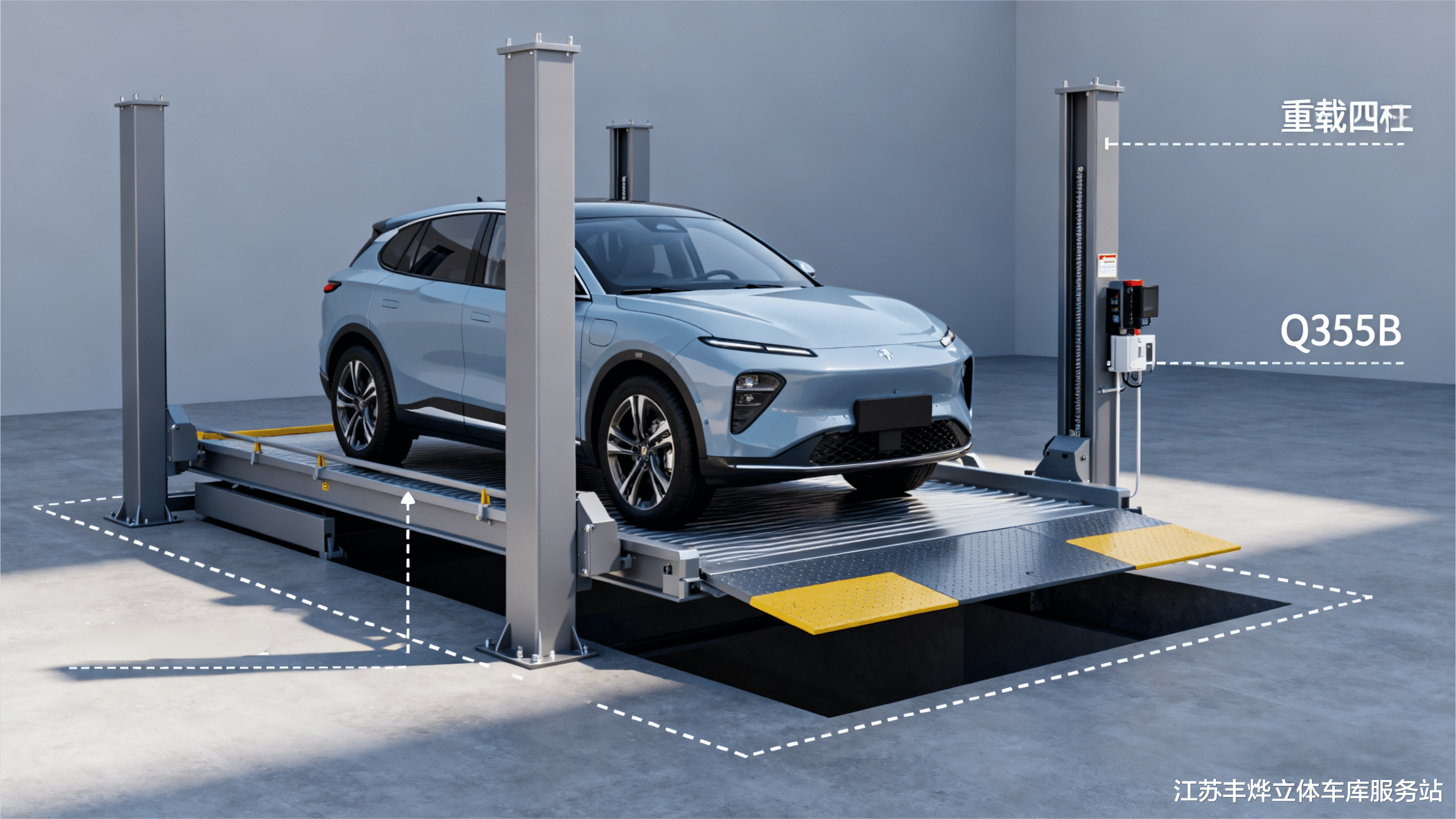 重载四柱式机械式立体车库:四柱采用Q355B高强度钢材,柱体直径达20cm,通过分布式承重设计分散压力,承重上限3吨,适配新能源轿车,SUV等重型车辆,安装时可灵活调整柱体间距以适应场地。