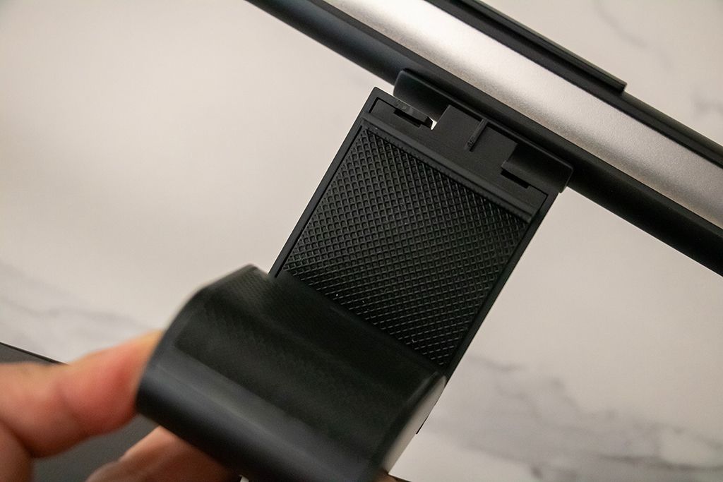 灯体与夹板的安装操作非常简单,只需轻松旋转,露出灯条上的品牌logo即可。拆下时则相反方向旋转,向下取下灯体即可。使用硅胶夹板1秒即可完成固定,稳固不晃动。夹板挂架可随意调节角度,满足不同角度需求。