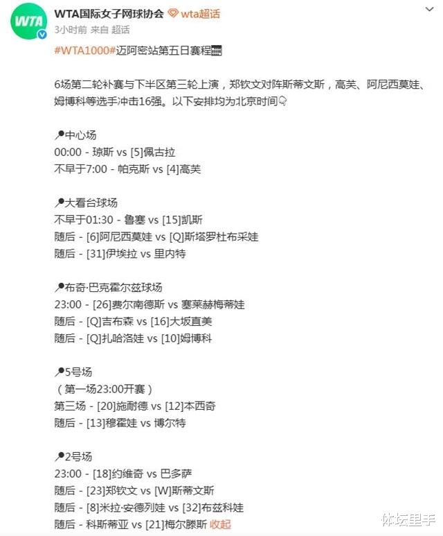 由于迈阿密的大雨,导致郑钦文与斯蒂文斯的对决延期,最新赛程显示:这场比赛延后到了北京时间3月22日凌晨,也就是在约维奇vs巴多萨之后。对于前美网冠军斯蒂文斯而言,与郑钦文的迈阿密站第二轮对决,将会是她冲击WTA1000赛百胜里程碑的一战!