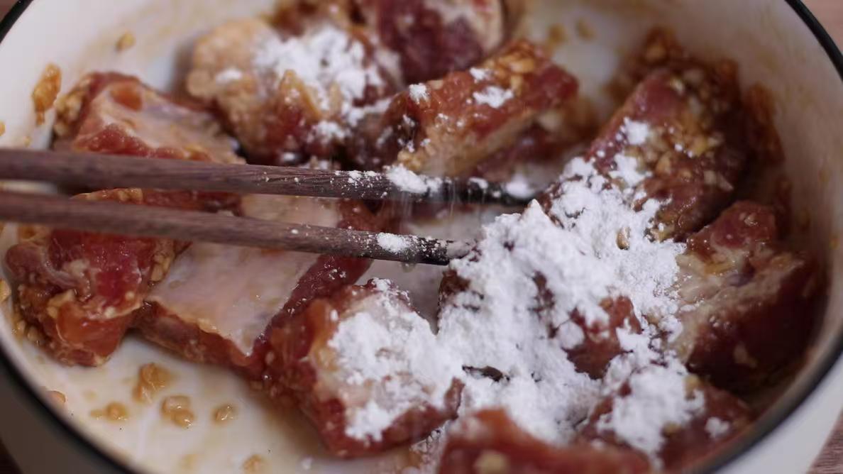1. 将腌制好的排骨取出,均匀地裹上一层生粉。