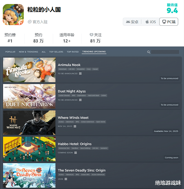《粒粒的小人国》的首曝实机PV,像一颗投入湖面的石子,激起了远超预期的涟漪。短短数日,全网相关话题热度突破亿次,在抖音、小红书等平台热度高涨,TapTap平台评分稳居9.6高分,预约人数迅速突破86万并持续霸榜至今。