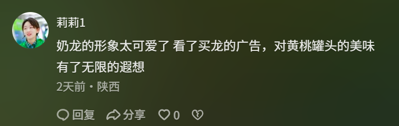 传播层面:围绕“桃”离负面情绪等情感化主题,结合“奶龙探厂”“妈妈实验室”等透明化、趣味化内容——既打破了消费者对罐头食品的刻板印象,又通过“健康+快乐”的品牌认知,让家长、年轻人都愿意购买。
