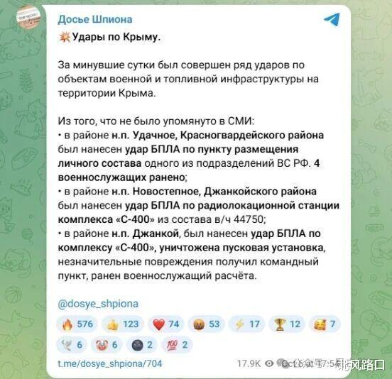 Dosye Sphiona频道称,过去24小时内,乌克兰无人机多次袭击克里米亚地区的军事和燃料基础设施。乌达奇内的一个俄军驻地遭袭,造成四名士兵受伤;新斯特普内附近的一套S-400雷达系统被击中、占科伊的S-400防空导弹系统的发射装置被摧毁,指挥车受损,一名机组人员受伤。