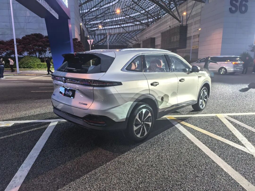 来到车身侧面,长安CS75 PLUS HEV与燃油版车型造型基本相同,腰线贯穿车身,前侧翼子板微微突出车体,采用传统的机械门把手设计,车窗边框与侧裙位置均有镀铬装饰点缀,从申报信息来看,新车将提供18英寸、19英寸以及20英寸的三款轮圈可选。