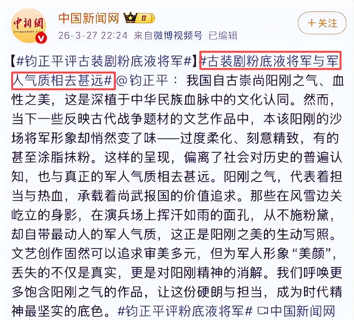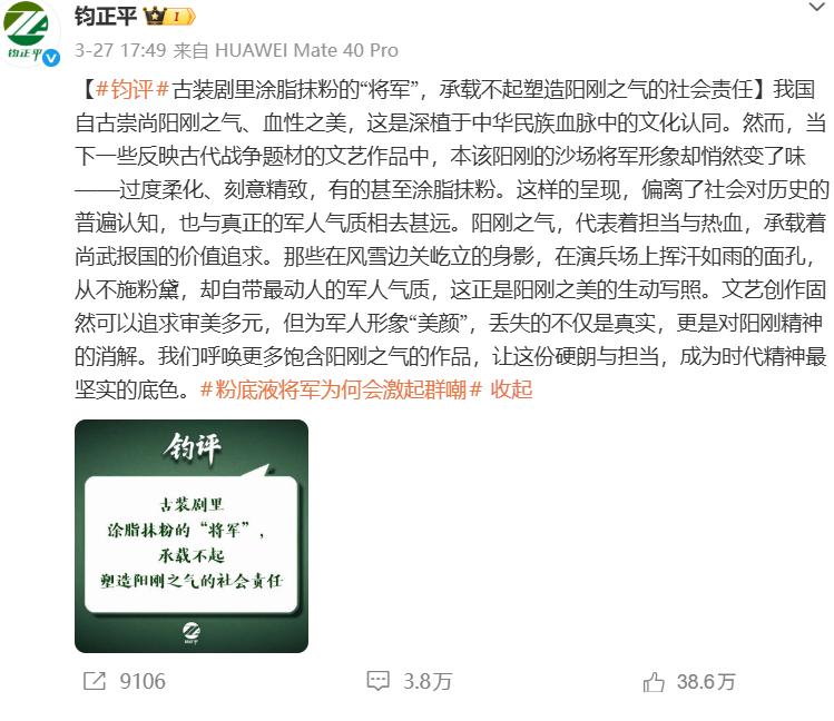 3月27日,钧正平工作室罕见发文点评影视乱象。
