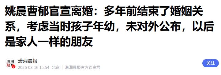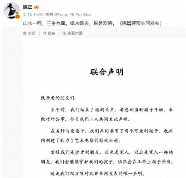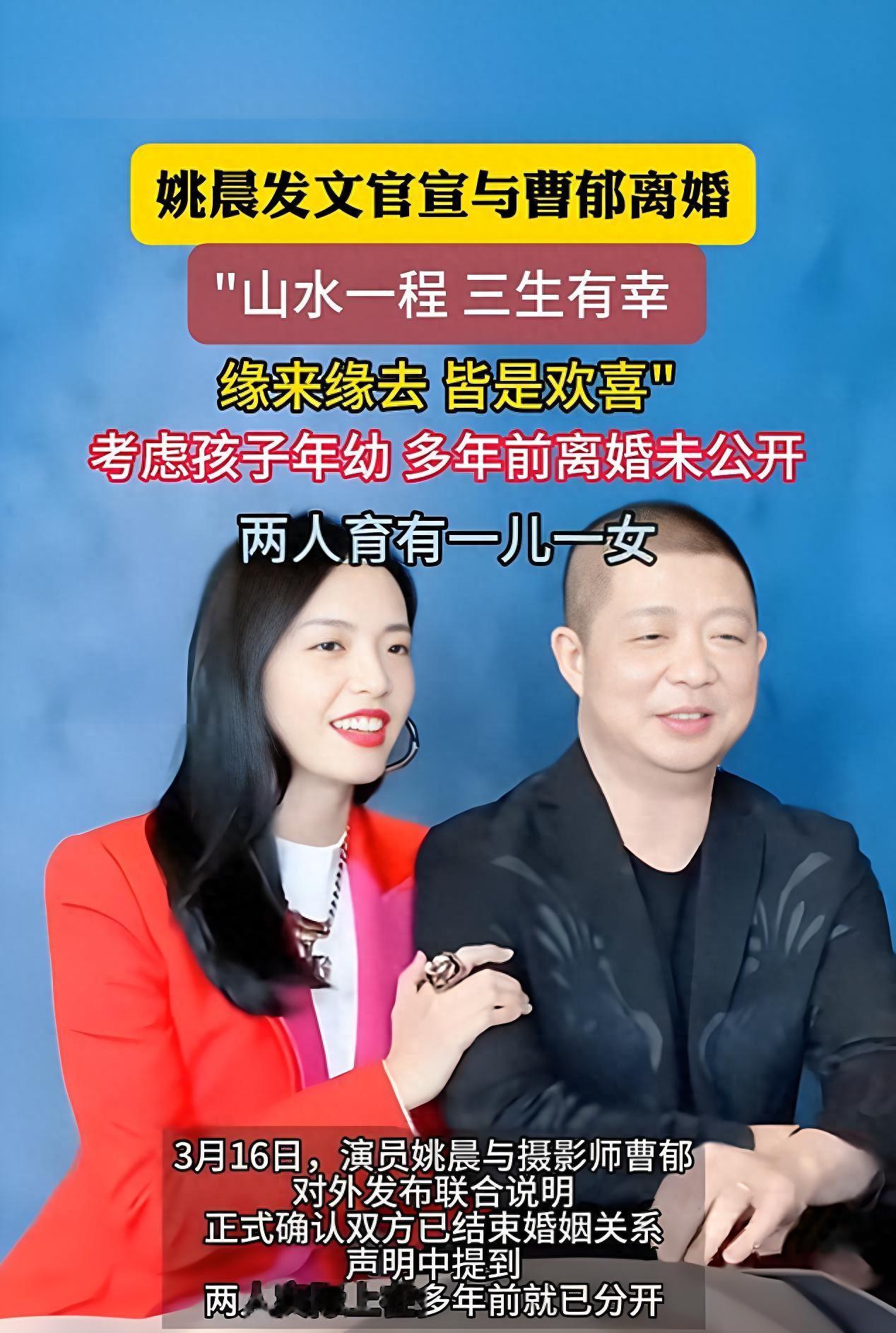 3月16日,姚晨在社交平台上发布与曹郁的离婚声明。