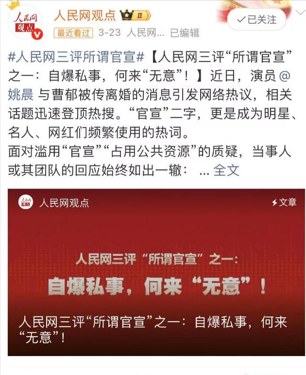 3月23日,人民网专门发布评论文章,直接点名姚晨
