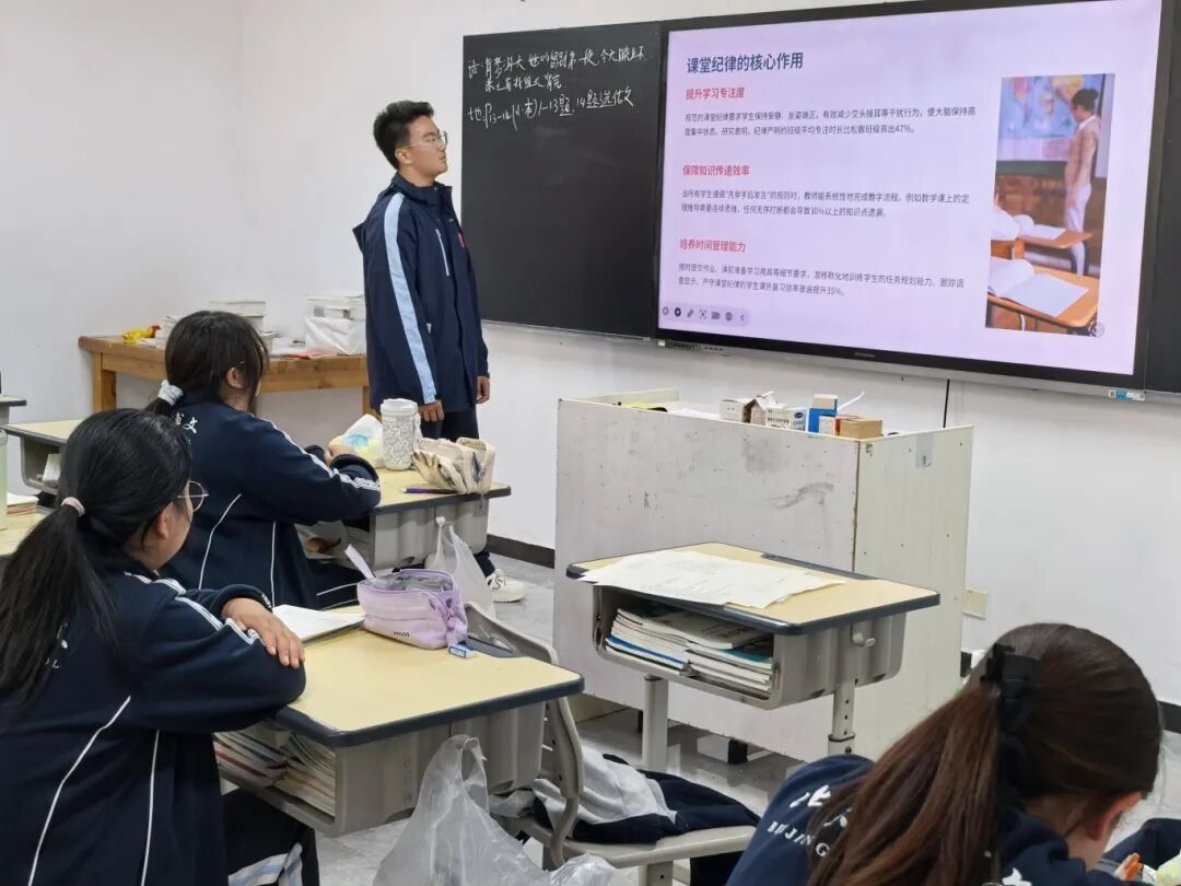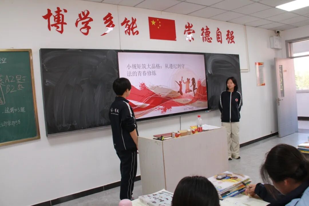 班会课上,班主任们以讲座案例为切入点,引导学生展开热烈讨论:“如何将法律底线转化为校园纪律自觉?”“课堂专注、课间文明、排队有序这些‘小规矩’,如何助力我们养成大品格?” 同学们结合自身经历踊跃发言,有的分享遵守纪律带来的高效学习体验,有的反思曾忽视的纪律细节,还有的提出 “班级法治监督小岗位” 的创意想法。各班还通过 “纪律承诺”“法治知识小问答”“校园纪律情景模拟” “你比我猜” 等互动环节,让 “遵纪是守法的起点,品格是青春的底色” 这一理念深入人心。