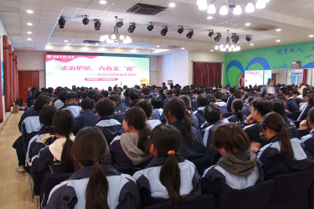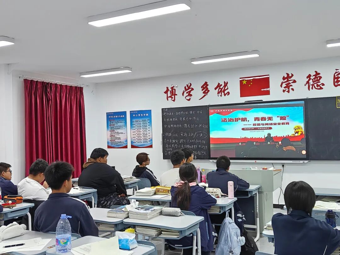 房山区窦店镇派出所副所长纪建民、学校法治副校长刘金瑞、学校德育副校长翟宇共同到场。本次讲座由纪建民副所长主讲,他在校园与网络安全案例处理方面经验丰富。他围绕校园安全、游戏沉迷、校园霸凌、防范电信网络诈骗四大核心议题,用真实案例拆解法律边界,以通俗语言传递法治精神:明确 14 岁、16 岁、18 岁三个法律责任关键节点,让学生清晰认知行为 “红线”;揭露游戏充值陷阱背后可能引发的偷盗、抢劫等违法犯罪后果,敲响思想警钟;详细解读校园霸凌的构成要件与严重危害,引导学生坚决抵制暴力行为;警示个人信息泄露的潜在风险,教会学生守护自身权益。讲座最后,纪所长特别强调 “遇困求助父母、老师或警察” 的重要性,呼吁学子从点滴小事做起,将遵纪守法融入日常。