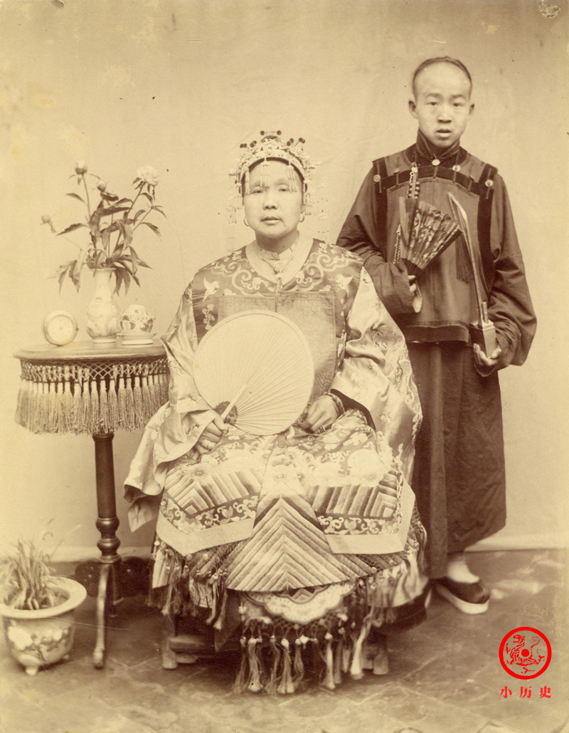 这位女子凤冠霞帔,缀补子(被蒲扇遮挡),由此判断她是一位经过朝廷封赏的诰命夫人。她也有品级,与丈夫官职相一致,一品、二品妻称夫人,三品称淑人,四品称恭人,五品称宜人,六品称安人,七品以下统为孺人,因子孙功绩受封者加“太”字。诰命夫人的衣服颜色与轴头纹饰标示等级。