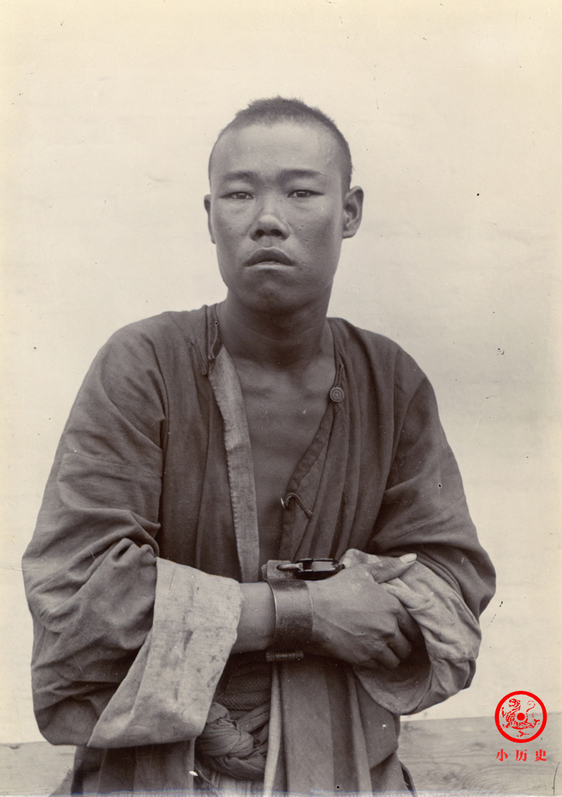 这个男人的表情,在那个时代比较有代表性:憨厚、麻木。他手腕上戴着镣铐,很可能是被官府抓捕的囚犯。