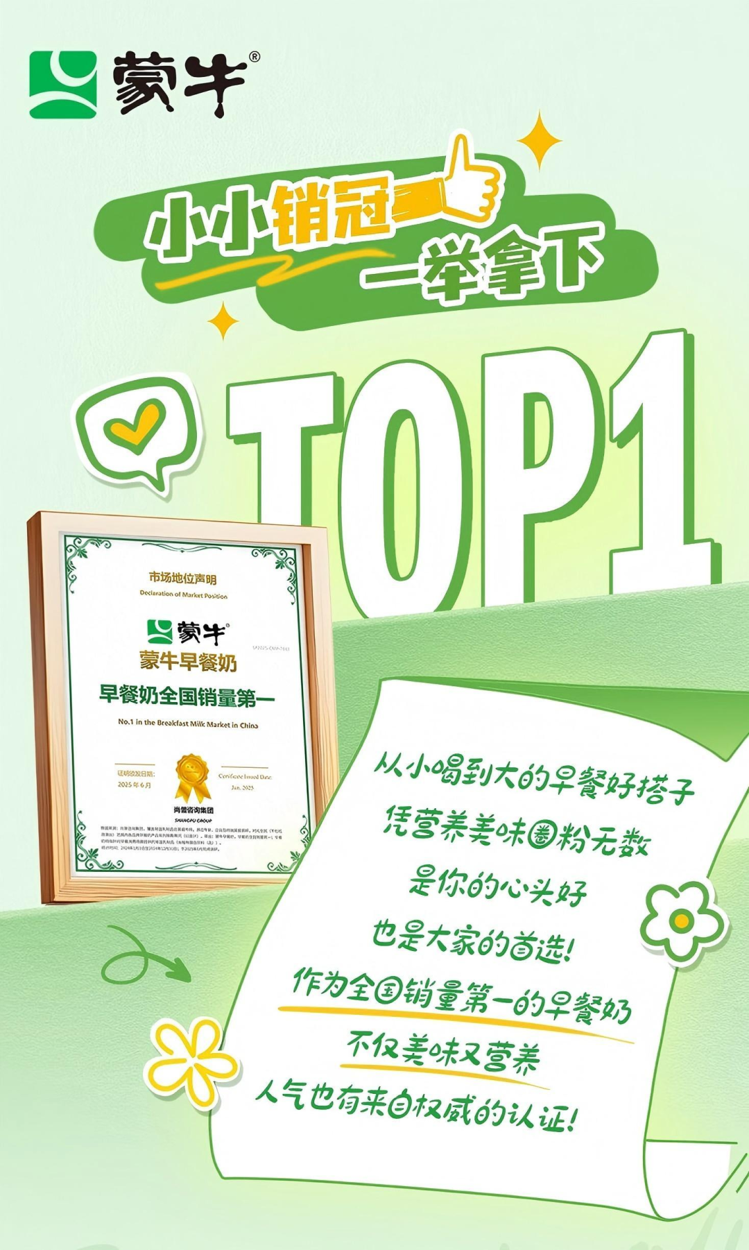 此次获得尚普咨询颁发的“蒙牛早餐奶·全国销量第一”认证,标志着蒙牛早餐奶在领跑品类市场、引领奶业高质量发展的卓越表现,获得了专业机构的充分肯定,也将吸引更多消费者选择蒙牛早餐奶,助力品牌实现持续增长。