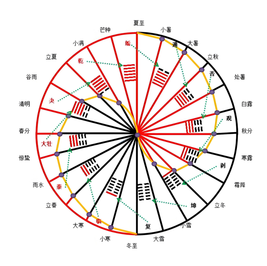 •天文历法领域:《易经》八卦与自然节律深度绑定,如后天八卦中“震为东、为春”“离为南、为夏”“兑为西、为秋”“坎为北、为冬”,构建了时空对应的宇宙模型。汉代孟喜、京房提出“卦气说”,将六十四卦与二十四节气、七十二候相配,形成精密的历法体系,指导农耕生产与日常生活,彰显了“观象授时”的实践智慧。