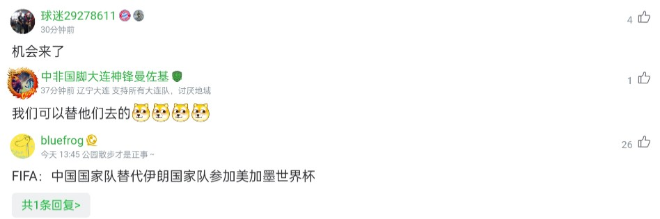 如果加上这次伊朗的事情处理不当,到时候就可能会出现一连串的不良反应,包括多国退赛的局面,而2026世界杯也可能就这样难以举办了。有国内的乐观球迷则喜滋滋地说:“(国足)机会来了……我们(国足)可以替他们去……”虽然这些铁杆球迷的热情高涨,但客观来说,国足递补参加世界杯的可能性不大。