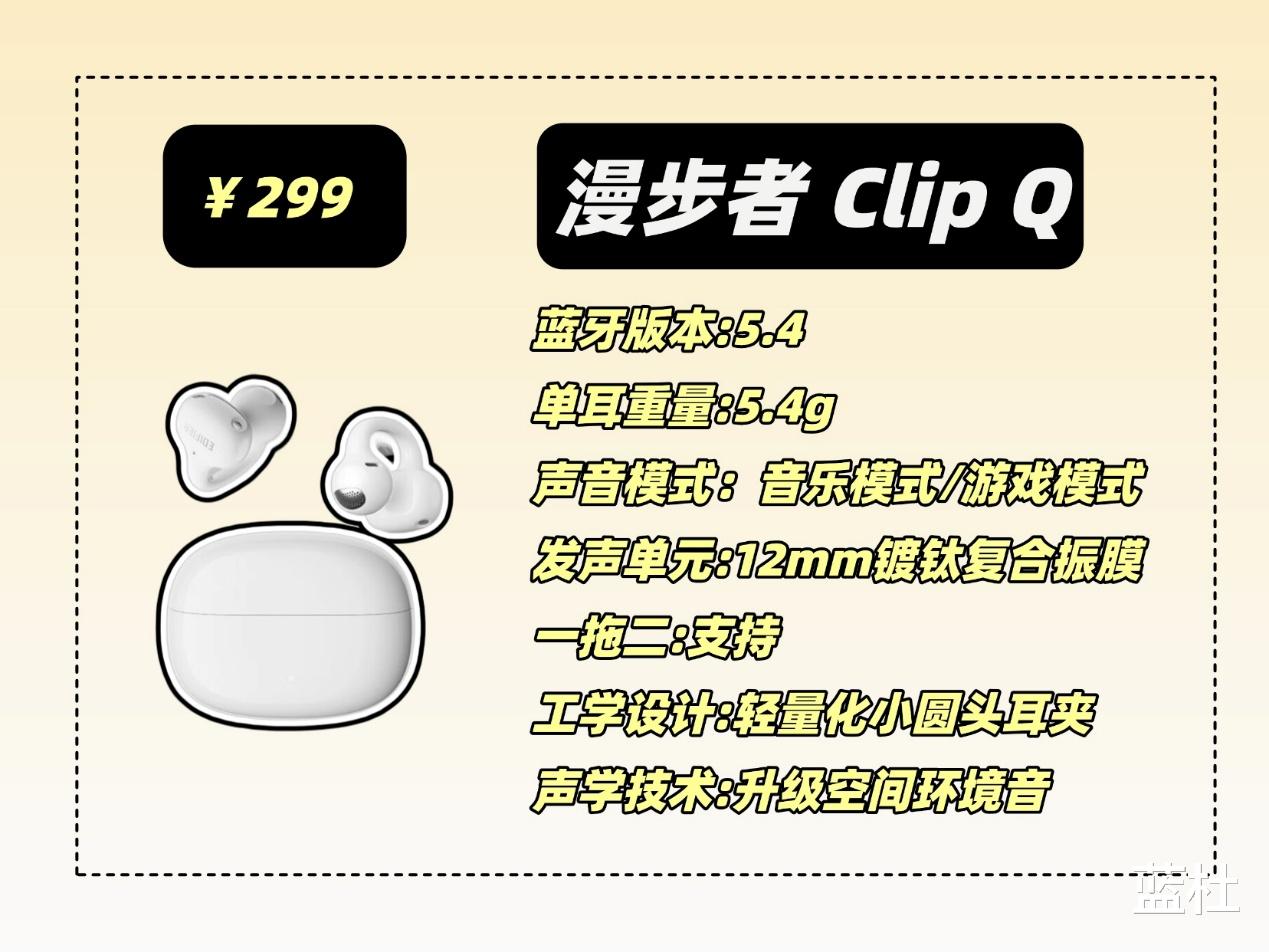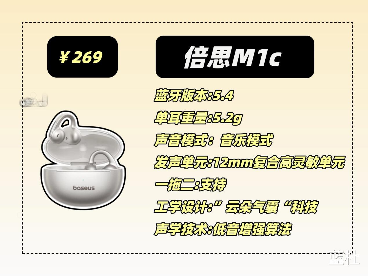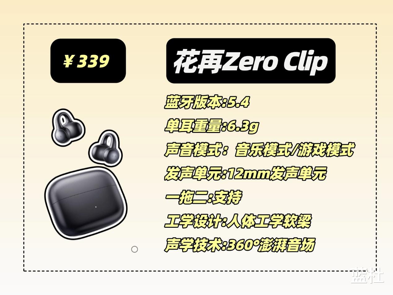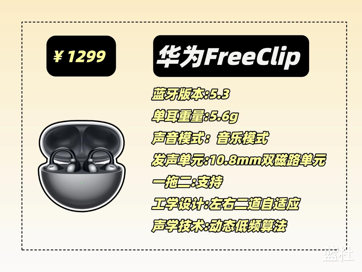 这款应该可以说是耳夹式耳机当中的王者了,采用人体工学设计,佩戴舒适,还不用分区左右耳,拿取都很方便,音质方面采用的是10mm的双磁路高灵敏度单元和动态低频算法,音质十分清晰,低音有很强的澎湃感,还支持L2HC编码技术,声音出色,芯片采用的是蓝5.3芯片,还有这36个小时的长续航和四麦克风通话降噪技术,就是价格比较高,喜欢的可以攒点强!