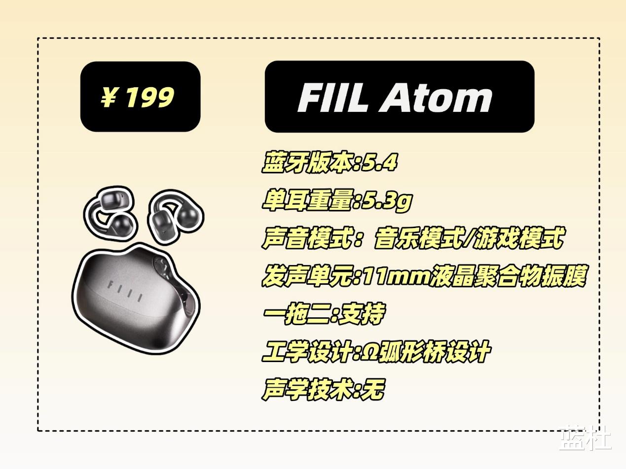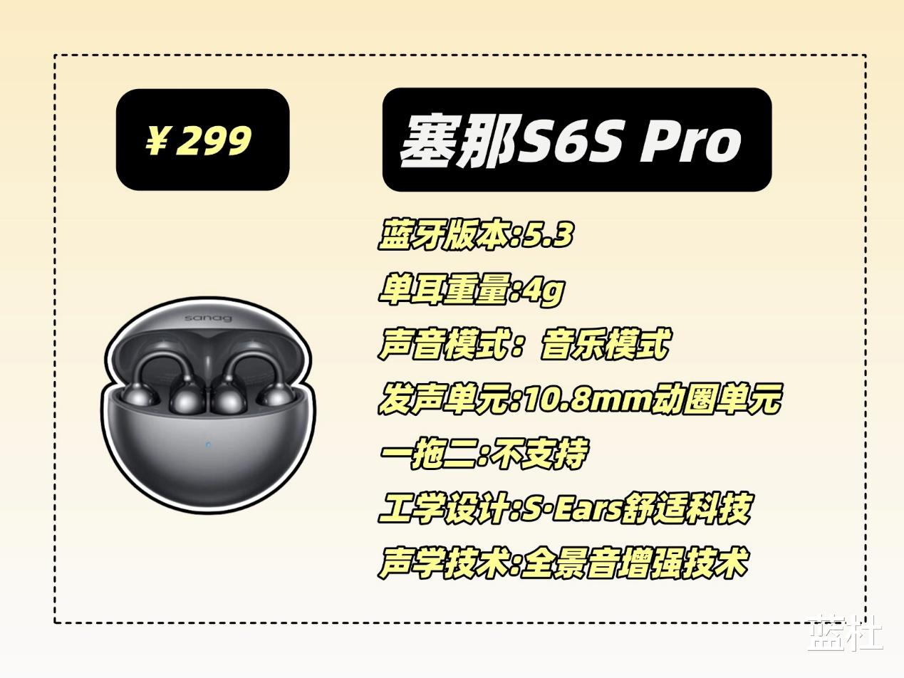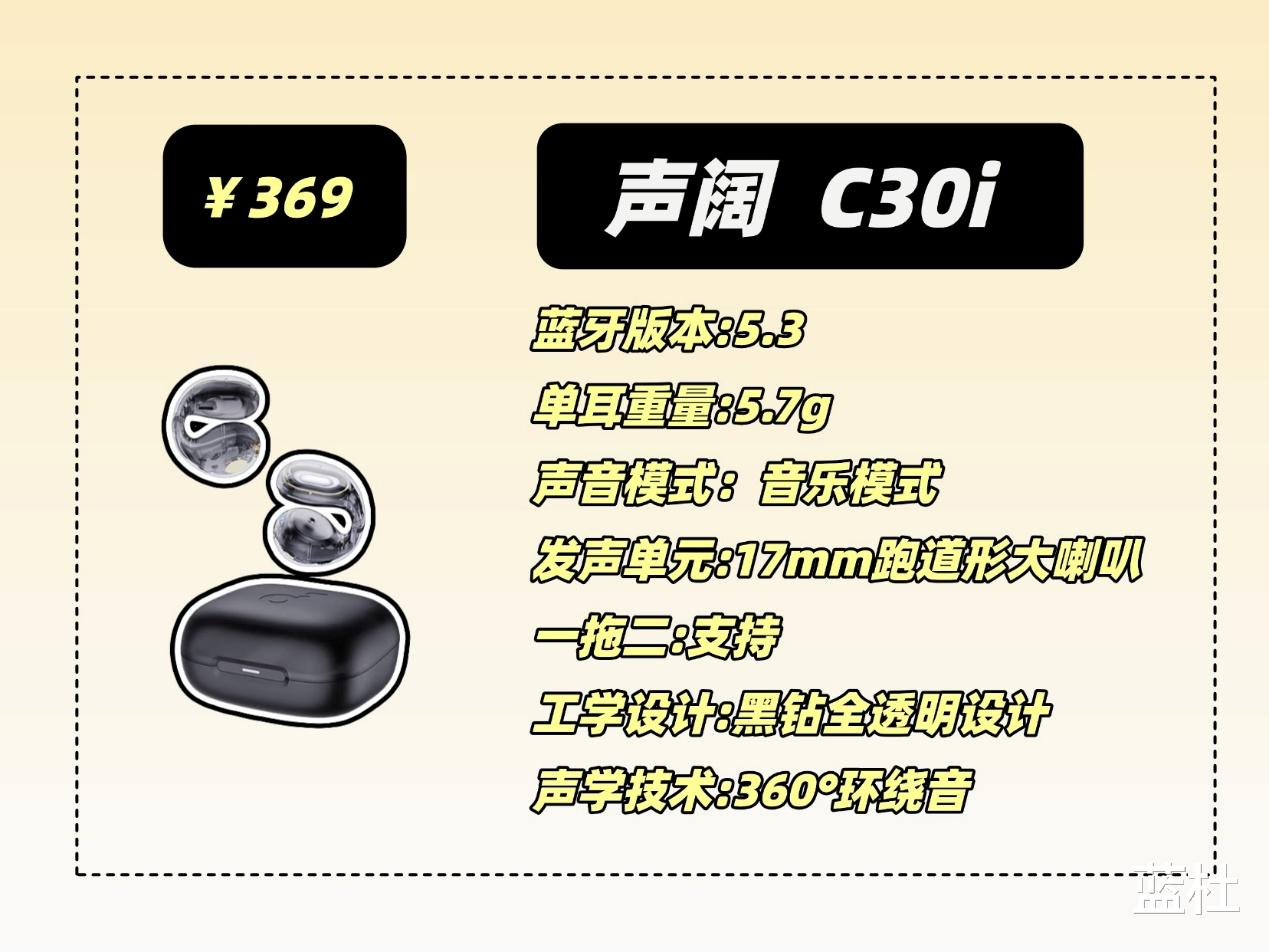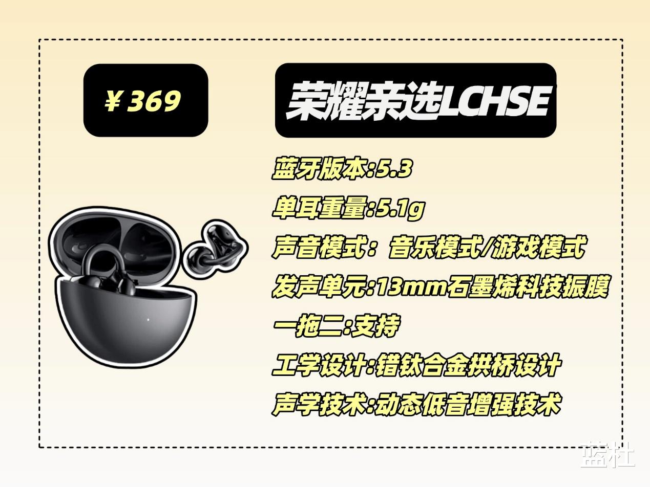 这款应该可以说是耳夹式耳机当中的王者了,采用人体工学设计,佩戴舒适,还不用分区左右耳,拿取都很方便,音质方面采用的是10mm的双磁路高灵敏度单元和动态低频算法,音质十分清晰,低音有很强的澎湃感,还支持L2HC编码技术,声音出色,芯片采用的是蓝5.3芯片,还有这36个小时的长续航和四麦克风通话降噪技术,就是价格比较高,喜欢的可以攒点强!