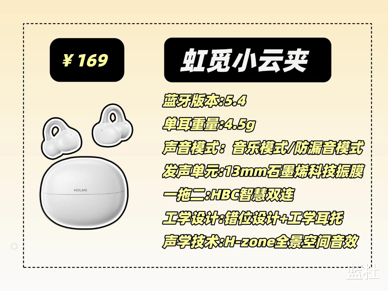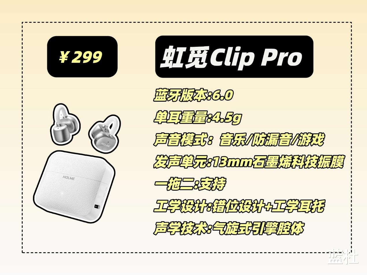 小云夹给我最大的感受就是十分全面,先说佩戴,它采用的是前高后低的2.5mm的错位设计,耳机能够完美融入到耳廓当中,佩戴很稳定,此外,它还把耳机的电池仓部位设计成了∠12弧面耳托,可以很完美的贴合耳部轮廓,再加上单耳仅有4.5g的超轻重量,耳机佩戴起来还是很舒服的,音质方面,小云夹的表现特别吸引我,它使用的是13mm的石墨烯科技振膜,这种材质有着优秀的形变优势,音质不易失真,此外,耳机还支持H-zone全景空间音效,能够拓宽声场,让声音更有氛围感,再加上虹觅声学实验室的调音下,声音表现十分自然,耳机还支持虹觅自研的防漏音模式,一键开启后能够明显感受到降漏音效果,这不就解决了开放式耳机常见的漏音问题吗?另外,他还支持蓝牙5.4芯片,支持HBC智慧双联功能,可以把一副耳机当成两副耳机来使用,还有IPX5级别的防水和8+24小时的防水效果,这配置,在百元价位可以说是最有性价比的耳机了!