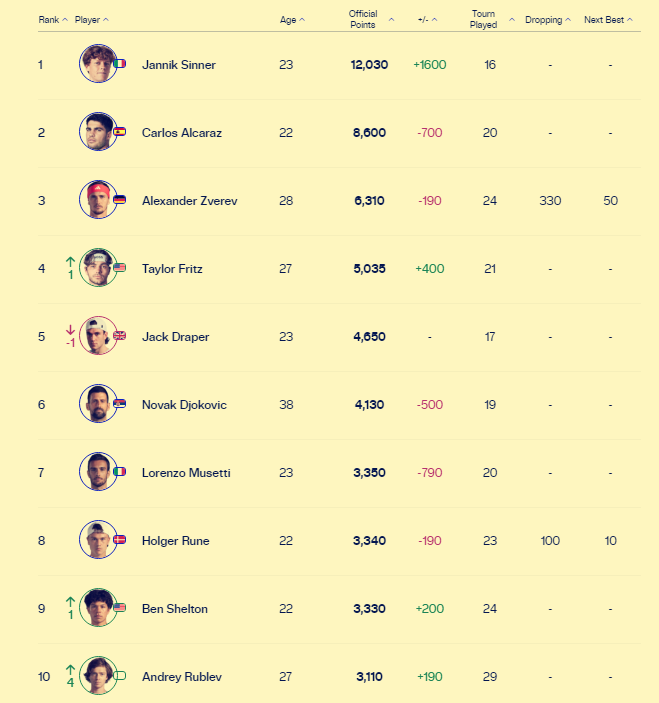 我们再来关注积分排名榜。北京时间昨天中午,ATP和WTA相继公布了最新一期积分排名榜。男单方面:新科温网冠军辛纳扩大了领先优势,以12030分高居榜首,西班牙红星阿尔卡拉斯以8600位居次席,分差拉大到了3430分。其他TOP10的排名略有波动,俄罗斯名将卢布列夫以3110分重返TOP10。