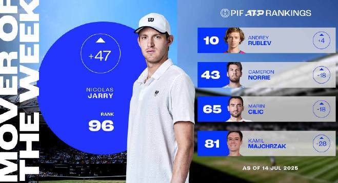 本周的 “排名之星”是智利名将贾里,他凭借温网16强的成绩,把自己的排名从143位提升至第96位,重返TOP100。