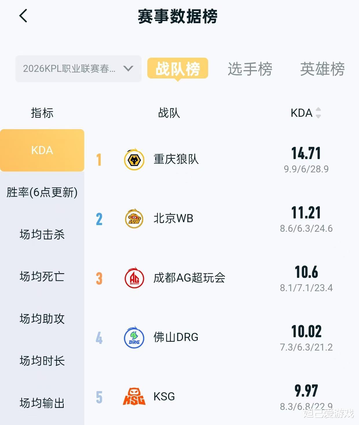 对一支战队来说,KDA是一项非常重要的数据,它体现了一支队伍的击杀、阵亡以及助攻,在本次春季赛,狼队的KDA实现断崖式领先,14.71的KDA比北京WB的11.21高了非常多,同时大幅度领先S1JDG战队的7.29。