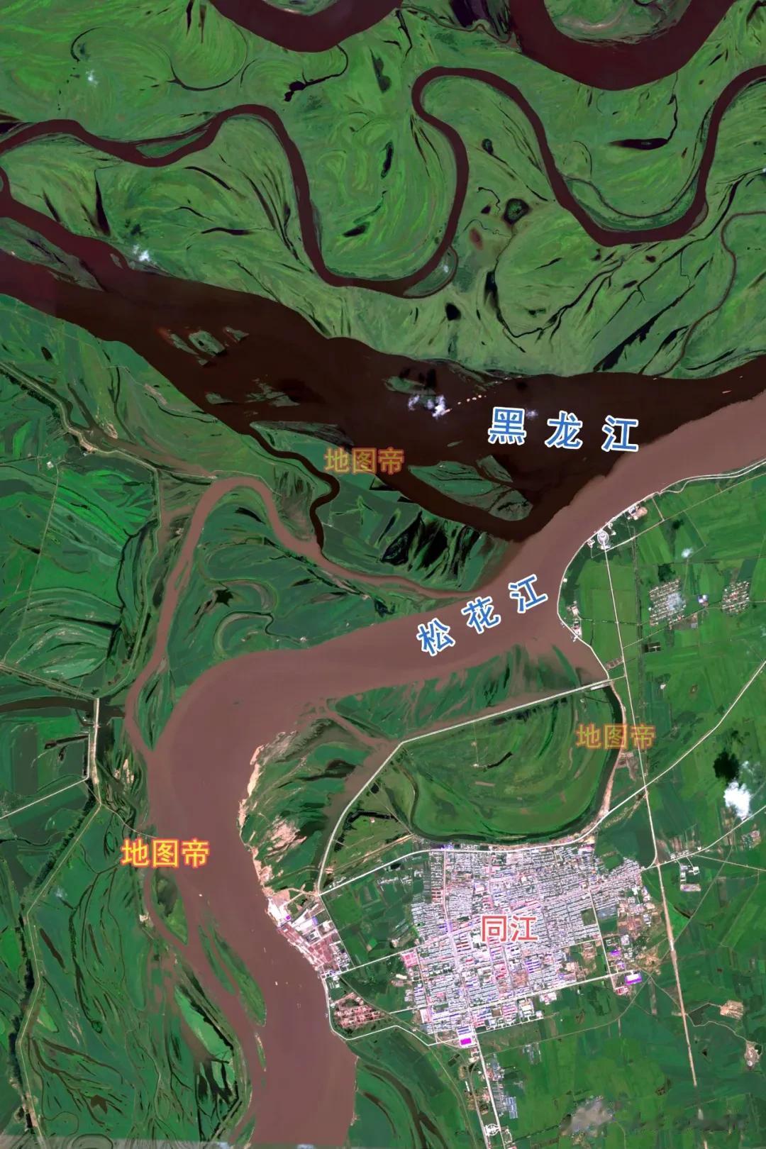 黑龙江自西向东奔流,江水呈墨绿色,松花江由西南至东北,江水裹挟泥沙较多,呈黄色。黑龙江与松花江在佳木斯的同江交汇,水面海拔44米,江面开阔,北黑南黄、泾渭分明,蔚为奇观。黑龙江从这里开始称为“混同江”,向东绵延数十里,才相拥相融,黑黄分界线才逐渐模糊。