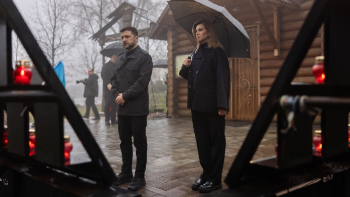 在冰冷的冬雨中,泽连斯基夫妇参加了悼念活动。