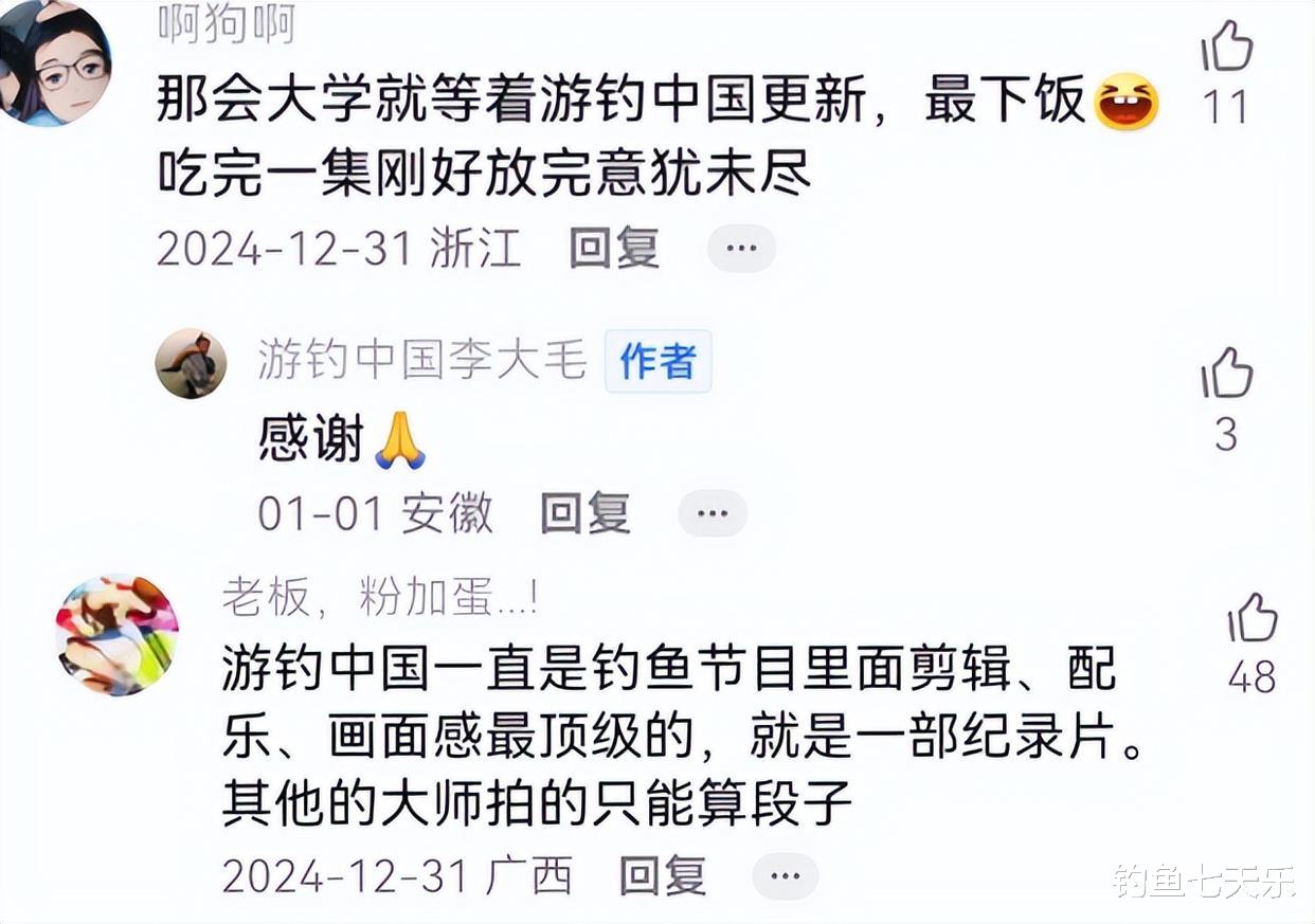 还有网友直言:“游钓中国”一直是钓鱼节目里面剪辑、配乐、画面感最顶级的,就是一部纪录片,其他大师拍的只能算段子。