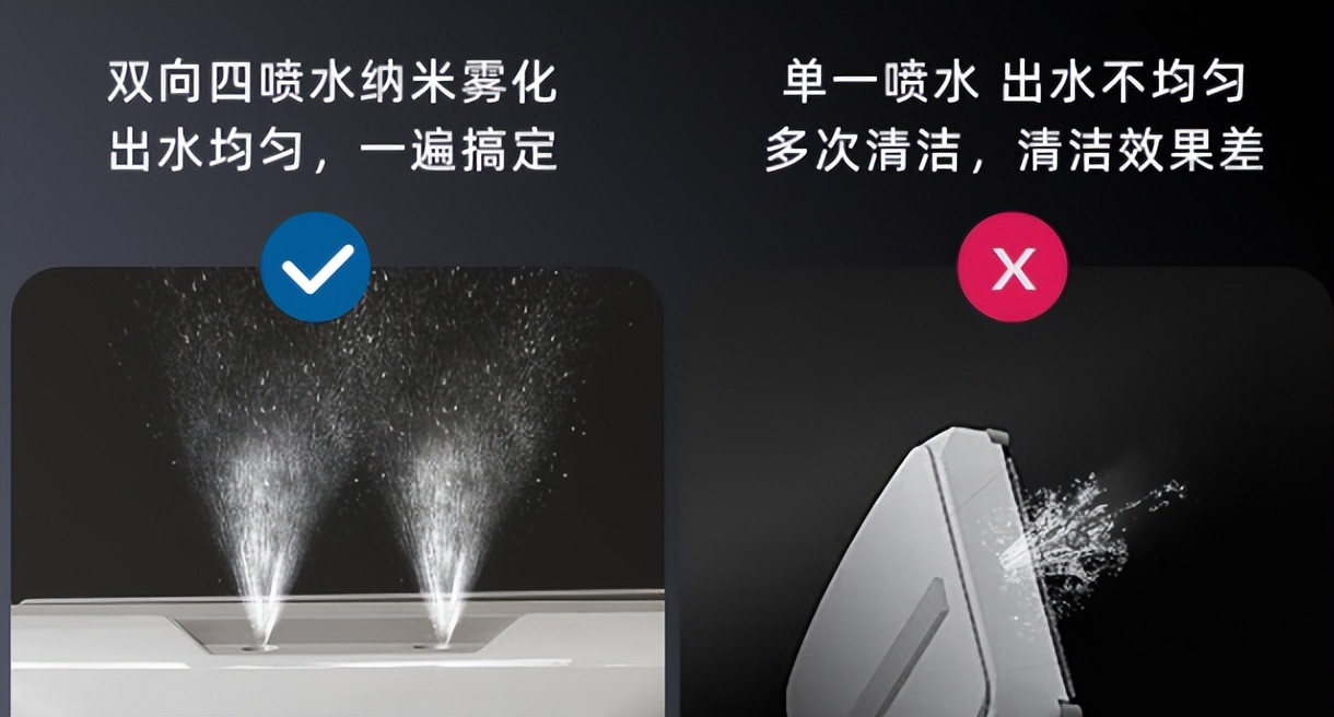 仿生喷水清洁:搭载超声波喷水技术,将水雾化成 15 微米超细水珠(仿人工哈气效果),388 款耗水量仅 1.4ml/㎡,S6 Pro 约 2.8ml/㎡,配合双清洁轮扭擦设计,污垢溶解更高效,擦后基本无水印。