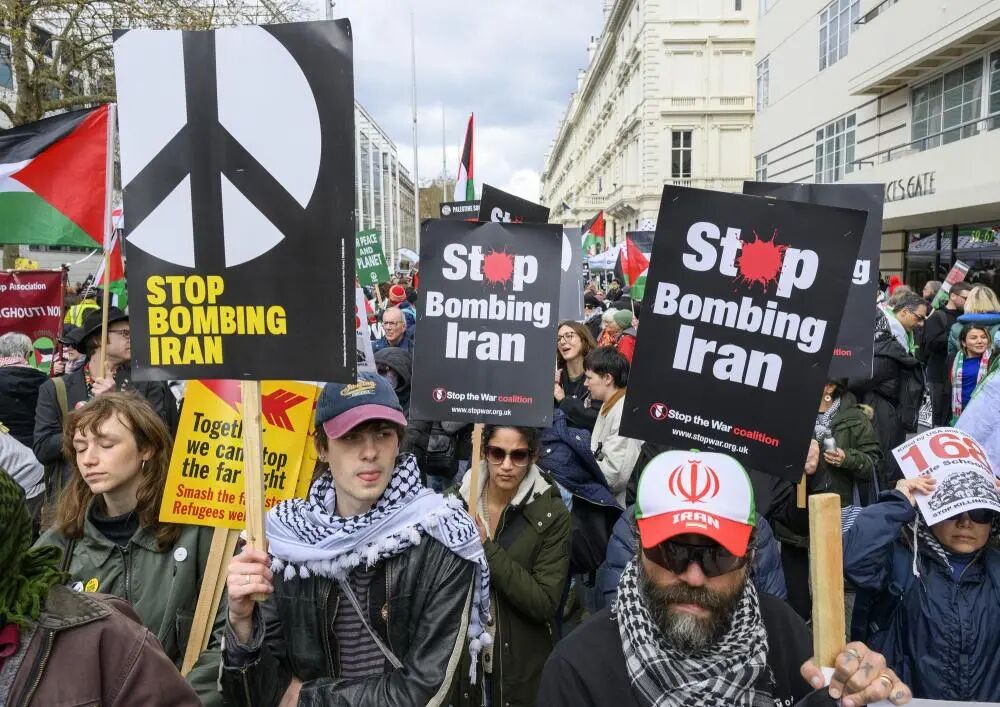 3月28日,人们在英国伦敦参加集会,抗议美国和以色列对伊朗发动军事打击。新华社发(雷伊·唐摄)