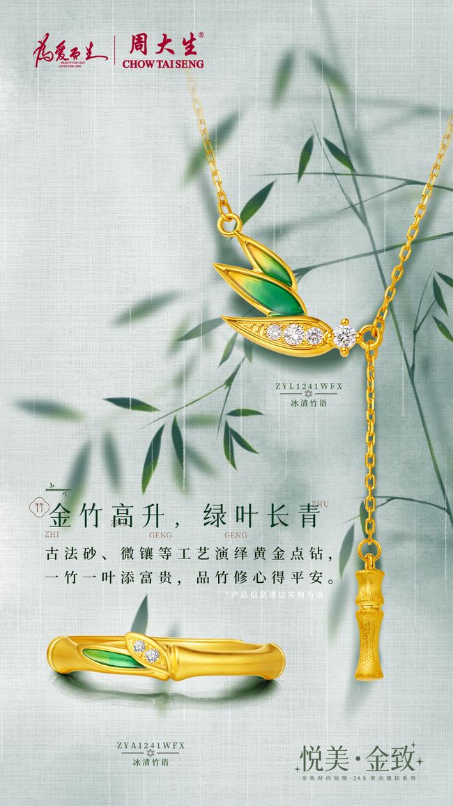 周大生研创的“福运绵长”“福禄延年”“冰清竹语”等新品设计灵感来自于中国的传统文化元素,结合足金镶钻工艺,演绎中国文创潮流概念,让传统文化通过珠宝艺术和创意形式“活起来”。值得一提的是,足金镶钻饰品以古法或5G黄金为底,不仅克服了黄金镶嵌易变形且不牢固的问题,还具备了更高的硬度、更好的韧性和延展性,也让黄金饰品的造型设计更具表达力。