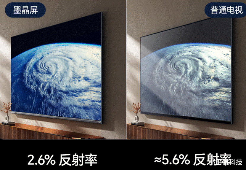 屏幕是它的另一大亮点,采用独家墨晶屏,融合了AG防眩光、LR低反膜、STW广视角三重技术,反射率低至2.6%,抗眩光能力比普通屏幕提升25%,黑位表现更是普通屏幕的两倍。这意味着不管你家白天大客厅,还是晚上开着灯看电视,画面都不会泛白,始终立体鲜活,坐在侧面看也不会有色差。