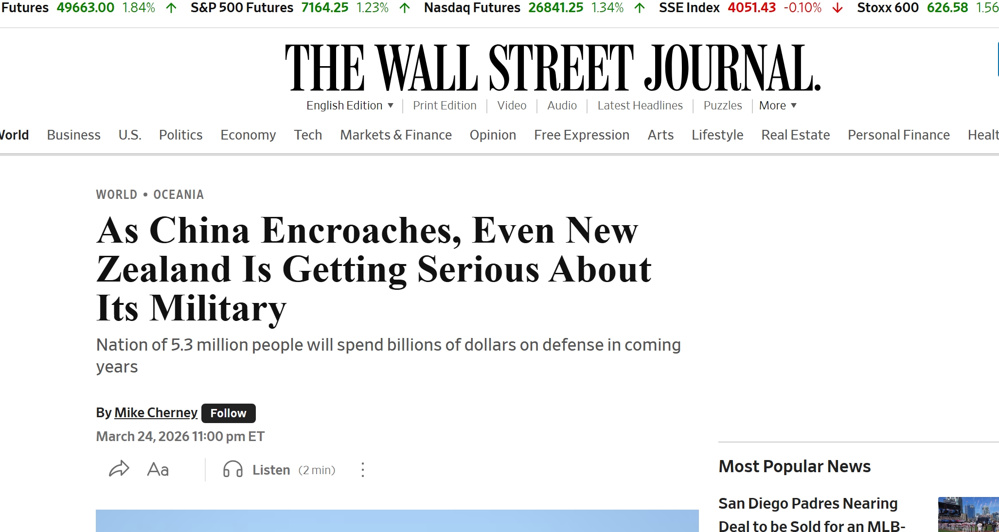 《华尔街日报》在这篇名为“随着中国的扩张,甚至新西兰也开始认真对待其军事问题”的文章中透露: